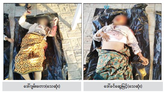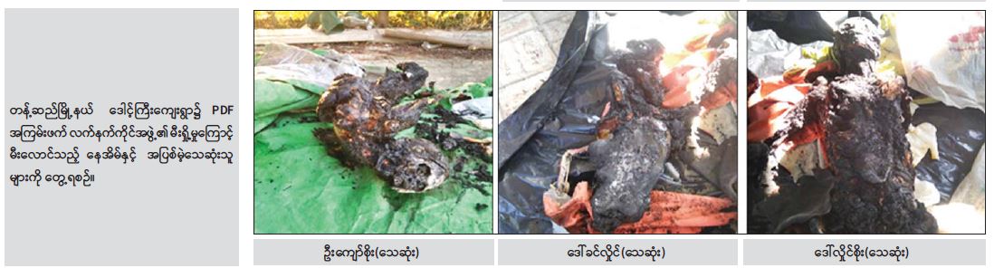 ထိုသို့ထွက်ပြေးတိမ်းရှောင်ကြရာ အသက်အရွယ်ကြီးရင့်၍ သွားလာလှုပ်ရှားရန် မလွယ်ကူသည့် အဆိုပါကျေးရွာနေ ဦးကျော်စိုး (၆၇) နှစ်(ဘ)ဦးဖိုးသိုးနှင့် ၎င်း၏မိသားစုဝင်များဖြစ်ကြသော ဒေါ်ခင်လှိုင်(၆၅)နှစ် (ဘ)ဦးဂျမ်း၊ ဒေါ်လှိုင်စိုး(၄၅)နှစ် (ဘ)ဦးကျော်စိုးနှင့် ဒေါ်ဂျမ်းတော(၈၅)နှစ် (ဘ) ဦးကျောက်ခဲ၊ ဒေါ်ခင်ဆွေမြင့်(၇၄)နှစ် (ဘ)ဦးကျောက်ခဲတို့သည် ၎င်းတို့၏နေအိမ်များ၌ ပုန်းအောင်း လျက်ရှိစဉ် အကြမ်းဖက်သမားများကနေအိမ်များအတွင်း ဝင်ရောက်ကာ “သတင်းပေး၊ ဒလန်” ဟု စွပ်စွဲပြောဆို၍ ရက်စက်စွာသေနတ်ဖြင့် ပစ်ခတ်သတ်ဖြတ်ပြီး နေအိမ်များအား မီးရှို့ဖျက်ဆီးခဲ့သည်။