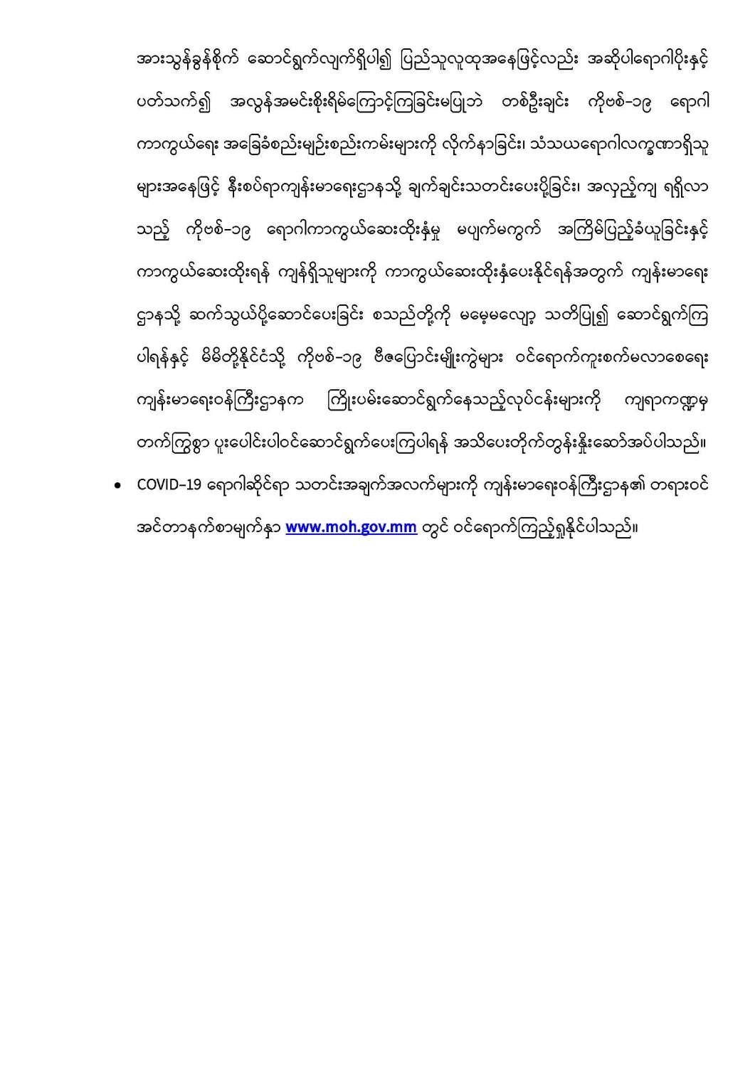 ကျန်းမာရေးဝန်ကြီးဌာနအနေဖြင့် နိုင်ငံအတွင်း ကူးစက်ဖြစ်ပွားနေသော COVID-19 ရောဂါ ကာကွယ်၊ ကုသ၊ ထိန်းချုပ်ရေးလုပ်ငန်းများကို အရှိန်အဟုန်မြှင့် ဆောင်ရွက်လျက်ရှိရာ ရောဂါ ထိန်းချုပ်ရေးလုပ်ငန်းများ အောင်မြင်နိုင်ရေးအတွက် ပြည်သူလူထုအနေဖြင့် ကျန်းမာရေးဝန်ကြီး ဌာနမှ ထုတ်ပြန်ထားသော COVID-19 ရောဂါ ကာကွယ်ထိန်းချုပ်ရေးဆိုင်ရာ စည်းကမ်းများကို စနစ် တကျ လိုက်နာဆောင်ရွက်ရန် လိုအပ်ပြီး COVID-19 ကာကွယ်ဆေးထိုးနှံမှု ခံယူခြင်းအား အထူး ဂရုပြု ပူးပေါင်းဆောင်ရွက်ကြရန် လိုအပ်ပါသည်။