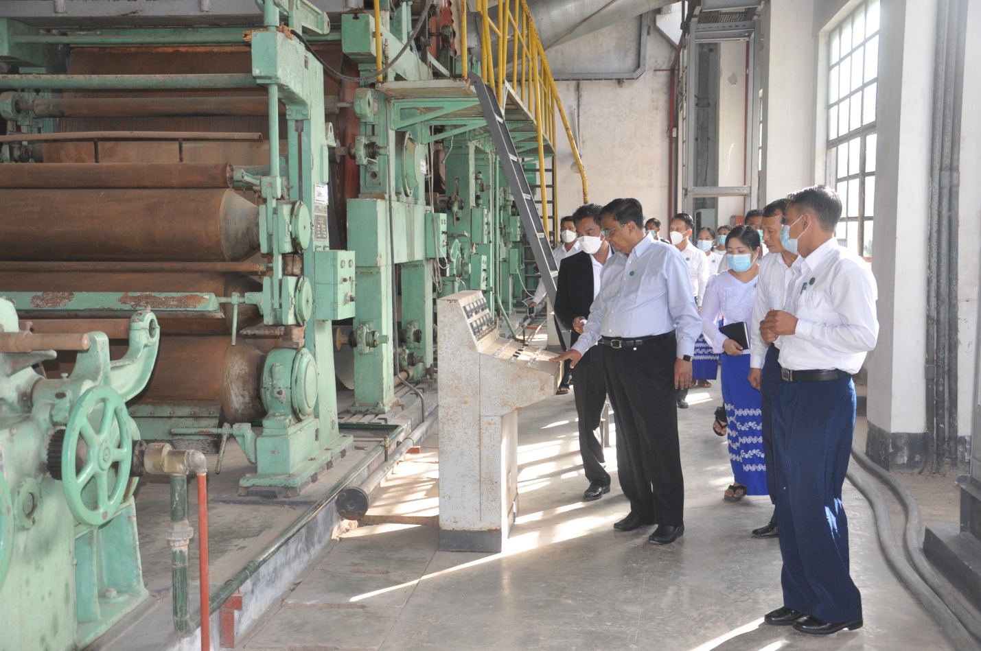 ဒီဇင်ဘာ (၁၈)ရက် နံနက်ပိုင်းတွင် ပြည်ထောင်စုဝန်ကြီးသည် စက္ကူ ထုတ်လုပ် မှုနည်းစဉ် အဆင့်ဆင့်တို့ကို လှည့်လည် ကြည့်ရှု စစ်ဆေးပြီး စက်ရုံရှိ စက်ပစ္စည်းများကို ပျက်စီးဆုံးရှုံးမှုမရှိစေရေး ပြုပြင်ထိန်းသိမ်းရေး လုပ်ငန်းများကို အမြဲမပြတ် ဆောင်ရွက်ရန် မှာကြားသည်။