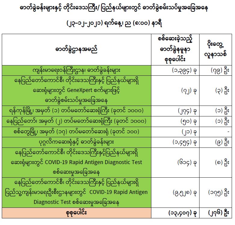 သို့ဖြစ်ပါ၍ ယနေ့အထိ ဓာတ်ခွဲနမူနာစုစုပေါင်း (၅,၉၅၀,၇၉၆) ခုအား စစ်ဆေးခဲ့ပြီး COVID-19 ဓာတ်ခွဲအတည်ပြုလူနာ စုစုပေါင်း (၅၂၉,၁၁၄) ဦး ရှိပြီ ဖြစ်ပါသည်။