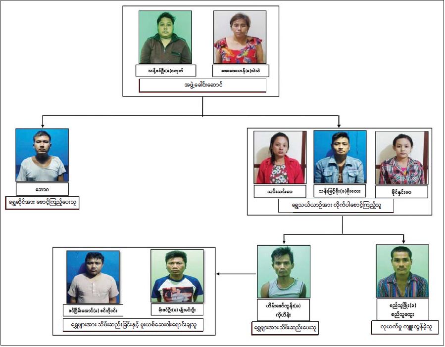 ဖြစ်စဉ်တွင် တရားခံ ကျား ၇ ဦး၊ မ ၃ ဦး၊ ပေါင်း ၁၀ ဦးကို ငွေကျပ် ၁၆၄ သိန်း ၄ သောင်း၊ ရွှေလက်စွပ်မျိုးစုံ ၂၈၄ ကွင်း၊ ရွှေနားကပ်မျိုးစုံ ၈၇ ရံ၊ ရွှေဆွဲပြားမျိုးစုံ ၄၄ ပြား၊ ရွှေဟန်းချိန်း ၁၂ ခု၊ ရွှေဆွဲကြိုးမျိုးစုံ ၆၇ ကုံး၊ ရွှေလက်ကောက်မျိုးစုံ ၂၃ ကွင်း၊ ရွှေကြယ်သီး ၂ ခု၊ WY စာတမ်းပါ စိတ်ကြွရူးသွပ်ဆေးပြား ၅၄၅၀ ၊ အငှားယာဉ် ၂ စီးတို့နှင့်အတူ ဖမ်းဆီးရမိခဲ့သည်။