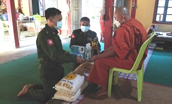 ထိုသို့ဆောင်ရွက်လျက်ရှိရာ ယနေ့တွင် ကရင်ပြည်နယ်၊ ကြာအင်းဆိပ်ကြီးမြို့၊ အမှတ်(၆)ရပ်ကွက်ရှိ အရဟံဘုန်းတော်ကြီးကျောင်း၊ ရန်ကုန်တိုင်းဒေသကြီး၊ မင်္ဂလာဒုံ မြို့နယ်၊ ထောက်ကြန့်တောင်ပိုင်း ရပ်ကွက်ရှိ ရသေ့တောင်ကျောင်းတိုက်၊ ဧရာဝတီတိုင်း ဒေသကြီး၊ ပုသိမ်မြို့၊ ဓမ္မဗိမာန်ကျောင်းတိုက်၊ စစ်ကိုင်းတိုင်းဒေသကြီး၊ ခန္တီးမြို့ရှိ တပ်ဦး နန္ဒဝန်ကျောင်းတိုက်၊ မန္တလေးတိုင်းဒေသကြီး၊ အောင်မြေ သာစံမြို့နယ်၊ စန္ဒရံသီ သီလရှင် စာသင်တိုက်တို့ရှိ ဆရာတော်၊ သံဃာတော် များနှင့် သာသနာနွယ်ဝင်သီလရှင်များ အတွက် ဆွမ်းဆန်တော်၊ ဆီ၊ ဆား၊ ပဲ အမယ်(၄)မျိုး၊ နဝကမ္မ အလှူငွေများ၊ ကိုဗစ်-၁၉ ရောဂါကာကွယ်ရေး အထောက်အကူပြုပစ္စည်းများ၊ နေ့ဆွမ်းများနှင့် လှူဖွယ်ပစ္စည်း များကို သက်ဆိုင်ရာ တိုင်းစစ်ဌာနချုပ်အသီးသီးမှ တာဝန်ရှိသူများက သွားရောက် ဆက်ကပ်လှူဒါန်းခဲ့ကြကြောင်း သတင်းရရှိသည်။