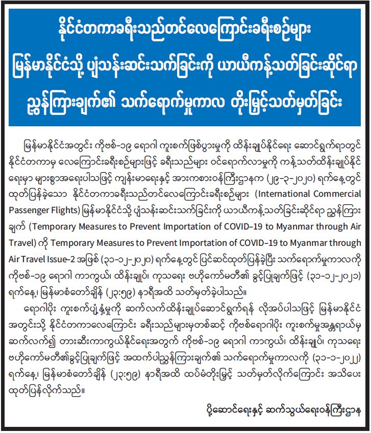 နိုင်ငံတကာခရီးသည်တင်လေကြောင်းခရီးစဉ်များ မြန်မာနိုင်ငံသို့ ပျံသန်းဆင်းသက်ခြင်းကို ယာယီကန့်သတ်ခြင်းဆိုင်ရာ ညွှန်ကြားချက်၏ သက်ရောက်မှုကာလ တိုးမြှင့်သတ်မှတ်ခြင်း