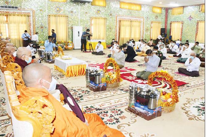 ဦးစွာ ဝန်ကြီးချုပ်၊ တိုင်းမှူးနှင့် တက်ရောက်လာကြသူများက နိုင်ငံတော်သံဃမဟာနာယက ဒုတိယဥက္ကဋ္ဌ ဆရာတော်ထံမှ ငါးပါးသီလခံယူ ဆောက်တည်ကြပြီး သံဃာတော်များအား လှူဖွယ် ပစ္စည်းများ ဆက်ကပ်လှူဒါန်းကြသည်။