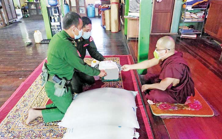ထိုသို့ဆောင်ရွက်လျက်ရှိရာ ယနေ့တွင် ရှမ်းပြည်နယ်(အရှေ့ပိုင်း) တာချီလိတ်မြို့ရှိ ဓမ္မသစ္စာ ကျောင်းတိုက်၊ ရန်ကုန်တိုင်းဒေသကြီး တောင်ဥက္က လာပမြို့နယ် အမှတ်(၁၅) ရပ်ကွက်ရှိ အောင်ခေမာ တွံတေးကျောင်းတိုက်၊ မှော်ဘီမြို့နယ် ဝါးနက်ချောင်း ကျေးရွာရှိမစိုးရိမ်ကျောင်းတိုက်၊ ဧရာဝတီတိုင်းဒေသ ကြီး ကျုံပျော်မြို့ရှိ မဏိရတနာရာ မကျောင်းတိုက်၊ ရခိုင်ပြည်နယ် အမ်းမြို့ရှိ မဟာဂန္ဓာရုံ အေးရိပ်သာကျောင်းတိုက်၊ မန္တလေးတိုင်းဒေသကြီး အောင်မြေသာဇံမြို့နယ် အတုမရှိ တိုက်ရွှေကျောင်းနှင့် ကရင်ပြည်နယ် သံတောင်ကြီးမြို့ရှိ သာသနာ့ဟိတကာရီ တပ်ဦးဘုန်းတော်ကြီး ကျောင်းတို့ရှိ ဆရာတော်၊ သံဃာတော်များနှင့် သာသနာ့နွယ်ဝင် သီလရှင်များ အတွက် ဆွမ်းဆန်တော်၊ ဆီ၊ ဆား၊ ပဲအမယ်လေးမျိုး၊ နဝကမ္မအလှူငွေများ၊ ကိုဗစ်-၁၉ ရောဂါ ကာကွယ် ရေး အထောက်အကူပြုပစ္စည်းများ၊ နေ့ဆွမ်းများနှင့် လှူဖွယ်ပစ္စည်းများကို သက်ဆိုင်ရာ တိုင်းစစ် ဌာနချုပ် အသီးသီးမှ တာဝန်ရှိသူများက သွားရောက် ဆက်ကပ်လှူဒါန်းကြကြောင်း သတင်း ရရှိသည်။