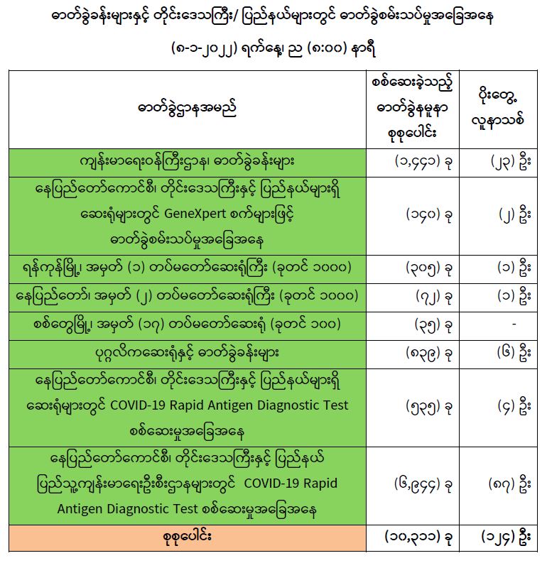 သို့ဖြစ်ပါ၍ ယနေ့အထိ ဓာတ်ခွဲနမူနာစုစုပေါင်း (၆,၁၂၂,၉၅၄) ခုအား စစ်ဆေးခဲ့ပြီး COVID-19 ဓာတ်ခွဲအတည်ပြုလူနာ စုစုပေါင်း (၅၃၁,၉၂၅) ဦး ရှိပြီ ဖြစ်ပါသည်။