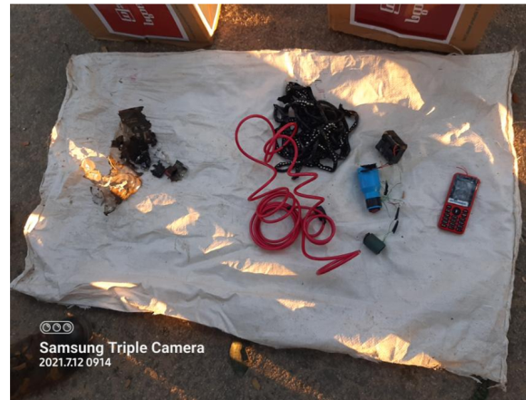 ဆက်လက်၍ လုံခြုံရေးတပ်ဖွဲ့ဝင်များသည့် စည်ပင်ရုံး ပတ်ဝန်းကျင်အား လိုက်လံစစ် ဆေးခဲ့ရာ စည်ပင်ရုံး ဝင်ပေါက်ယာဘက်ခြမ်း ပန်းခြုံ အတွင်းမှ ကီးပက်ဖုန်း ၁ လုံး၊ ဓါတ်ခဲ ၃ လုံး၊ ဒီတိုနေတာ ၁ ခု၊ အားမြှင့်ယမ်းကြိုး ၁ ချောင်းတို့ဖြင့် ချိတ်ဆက်ထားပြီး PVC ပိုက်ဖြင့် ပြုလုပ်ထားသည့် လက်လုပ်ရီမုမိုင်းတစ်လုံးအား ထောင်ထားသည်ကို တွေ့ရှိရသဖြင့် သက်မဲ့ပြု လုပ်သိမ်းဆည်းခဲ့သည်။