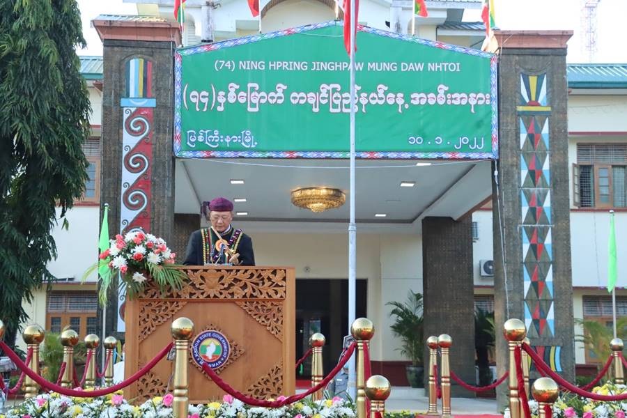 (၇၄)နှစ်မြောက် ကချင်ပြည်နယ်နေ့ အခမ်းအနားကို ယနေ့နံနက်ပိုင်းတွင် ကချင်ပြည်နယ်၊ အစိုးရအဖွဲ့ရုံး မြက်ခင်းပြင်၌ ပြုလုပ်ရာ နိုင်ငံတော်စီမံအုပ်ချုပ်ရေးကောင်စီအဖွဲ့ဝင် Jeng Phang နော်တောင်၊ ဦးမောင်းဟာ၊ ဦးစိုင်းလုံးဆိုင်၊ ဦးရွှေကြိမ်း၊ ပြည်ထောင်စုဝန်ကြီးများ ဖြစ်ကြသည့် ဒုတိယဗိုလ်ချုပ်ကြီး ထွန်းထွန်းနောင်၊ ဦးခင်ရီ၊ ဦးစောထွန်းအောင်မြင့်၊ ကချင်ပြည်နယ်ဝန်ကြီးချုပ် ဦးခက်ထိန်နန်နှင့် အဖွဲ့ဝင်များ၊ မြောက်ပိုင်းတိုင်းစစ်ဌာနချုပ် တိုင်းမှူး ဗိုလ်မှူးချုပ် မြတ်သက်ဦးနှင့် အဖွဲ့ဝင်များ၊ ဌာနဆိုင်ရာများမှ တာဝန်ရှိသူများနှင့် ဒေသခံတိုင်းရင်းသားပြည်သူများ တက်ရောက်ကြသည်။