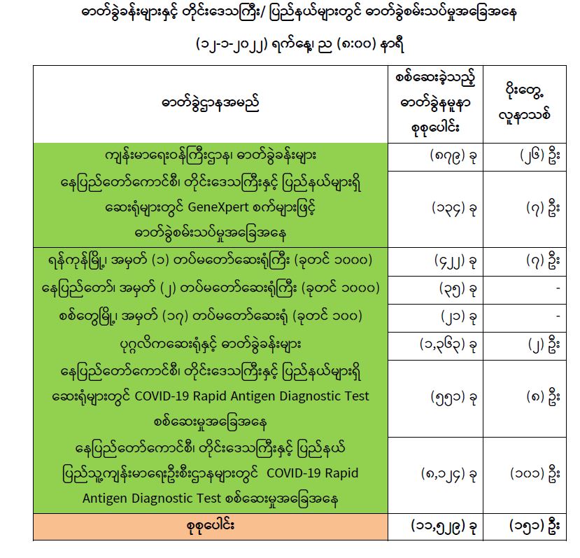 သို့ဖြစ်ပါ၍ ယနေ့အထိ ဓာတ်ခွဲနမူနာစုစုပေါင်း (၆,၁၆၄,၆၇၉) ခုအား စစ်ဆေးခဲ့ပြီး COVID-19 ဓာတ်ခွဲအတည် ပြုလူနာ စုစုပေါင်း (၅၃၂,၅၅၃) ဦး ရှိပြီ ဖြစ်ပါသည်။