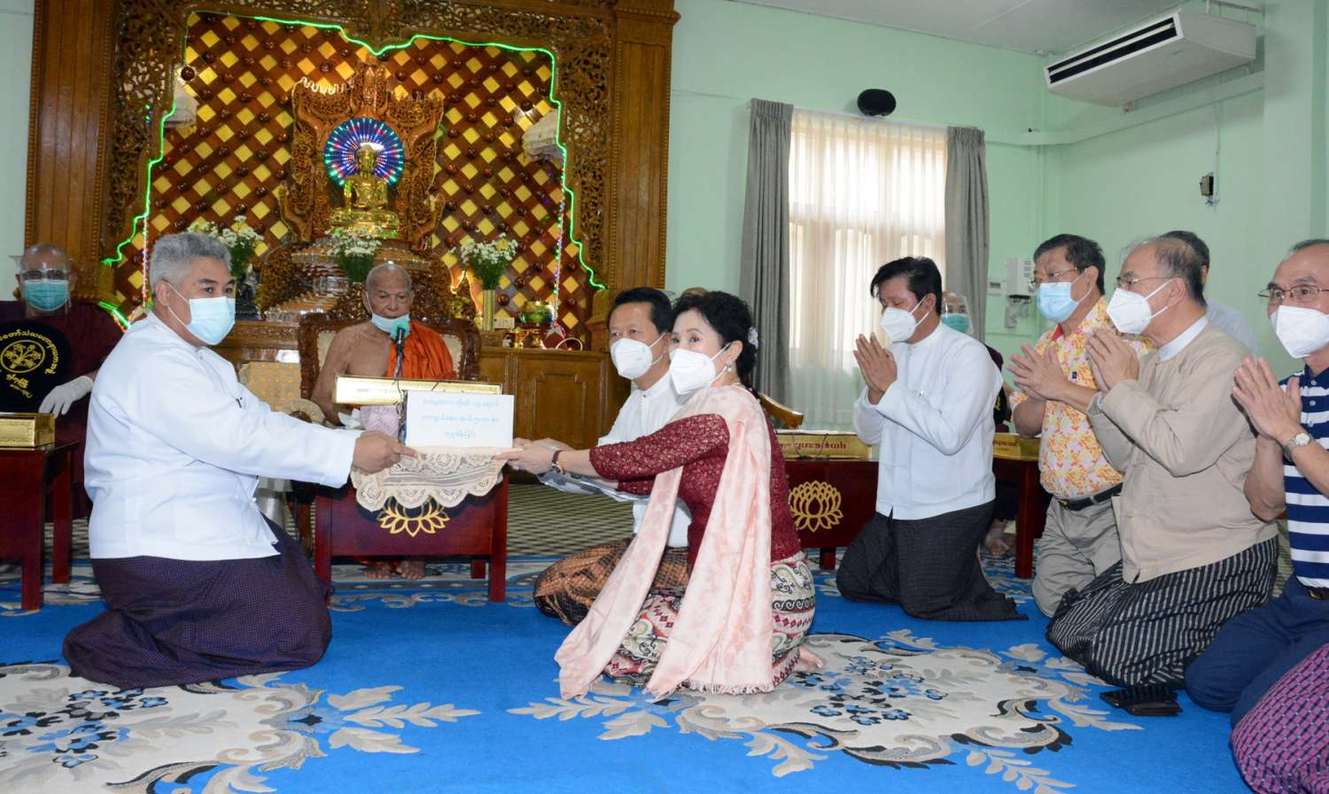 ယင်းနောက် အလှူရှင် Shenzhen ဗုဒ္ဓဘာသာအဖွဲ့ကိုယ်စား ဒေါ်ဌေးဌေးမော်နှင့် တရုတ်ကုန် သည်ကြီးများအသင်းဥက္ကဋ္ဌ ဦးအိုင်ထွန်းတို့က လှူဒါန်းခြင်း အကြောင်းကို လျှောက်ထားကြပြီး ကိုဗစ်−၁၉ ရောဂါ ကာကွယ်ဆေး ၅၀၀၀ ကို ပေးအပ်လှူဒါန်းကြရာ သာသနာရေးဦးစီးဌာန ဒုတိယညွှန်ကြားရေးမှူးချုပ် ဦးသိန်းဝင်းက လက်ခံရယူသည်။