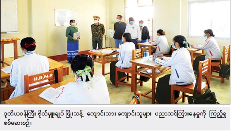 ထို့နောက် တက္ကသိုလ်စာကြည့်တိုက်၊ ပြတိုက်တို့ကို ကြည့်ရှုစစ်ဆေးပြီး ကိုဗစ်-၁၉ နှင့်အညီ ဖွင့်လှစ်လျက်ရှိသော ၂၀၁၉-၂၀၂၀ ပညာသင်နှစ် ပညာရေးဘွဲ့ သင်တန်းအမှတ်စဉ် (၅) စတုတ္ထနှစ် (ဒုတိယနှစ်ဝက်) သင်တန်းအတွက် စာသင်ဆောင်၊ အိပ်ဆောင်၊ စားရိပ်သာများကို ကြည့်ရှုစစ်ဆေး သည်။