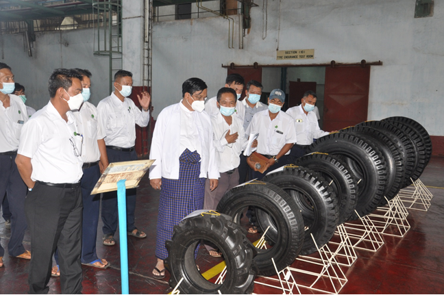 ထို့နောက် ပြည်ထောင်စုဝန်ကြီးနှင့်အဖွဲ့သည် ခရမ့်ရာဘာစက်ရုံသို့ရောက်ရှိပြီး ရာဘာထုတ်လုပ်နေမှု လုပ်ငန်းစဉ်အဆင့်ဆင့်ကို ကြည့်ရှုစစ် ဆေးသည်။