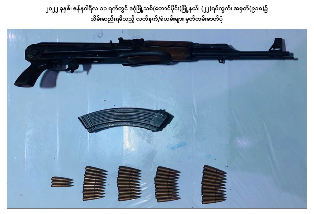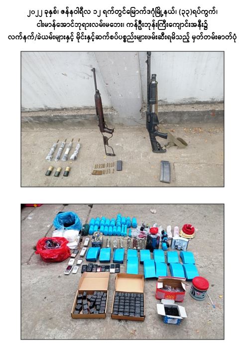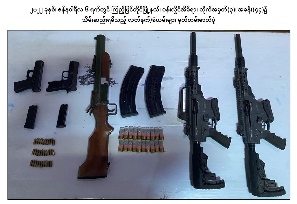 အကြမ်းဖက်အဖွဲ့အစည်းများဖြစ်သည့် CRPH၊ NUG နှင့် PDF အဖွဲ့များမှ အကြမ်းဖက်လုပ်ရပ်များ ဆောင်ရွက်နိုင်မှုမရှိစေရေး သတင်းလက်ဦးမှုရယူ၍ ဖော်ထုတ် ဖမ်းဆီးခြင်းများ ဆောင်ရွက်လျက်ရှိရာ ၂၀၂၂ ခုနှစ်၊ ဇန်နဝါရီလ ၆ ရက်တွင် ကြည့်မြင်တိုင်မြို့နယ်၊ ပန်းလှိုင်အိမ်ရာ၊ တိုက်အမှတ်(၃)၊ အခန်း(၄၄)၌ ရန်ကုန်တိုင်း ပကဖ အကြမ်းဖက်အဖွဲ့ အရှေ့ပိုင်းခရိုင်တာဝန်ခံ လင်းထက်(ခ)မဟူရာ (၃၆)နှစ်နှင့် ဇော်ကိုကို(၃၅)နှစ်တို့ ၂ ဦးအား Sigsauer ပစ္စတို ၂ လက်၊ ၎င်းကျည်အိမ် ၂ ခု၊ ၉ မမ ကျည် ၃၀ တောင့်၊ MK-12 သေနတ် ၂ လက်၊ ၎င်းကျည်အိမ် ၂ ခု၊ ၎င်းကျည် ၂၀ တောင့်၊ M-79 သေနတ် ၁ လက်တို့နှင့်အတူ ဖမ်းဆီးရမိခဲ့သည်။