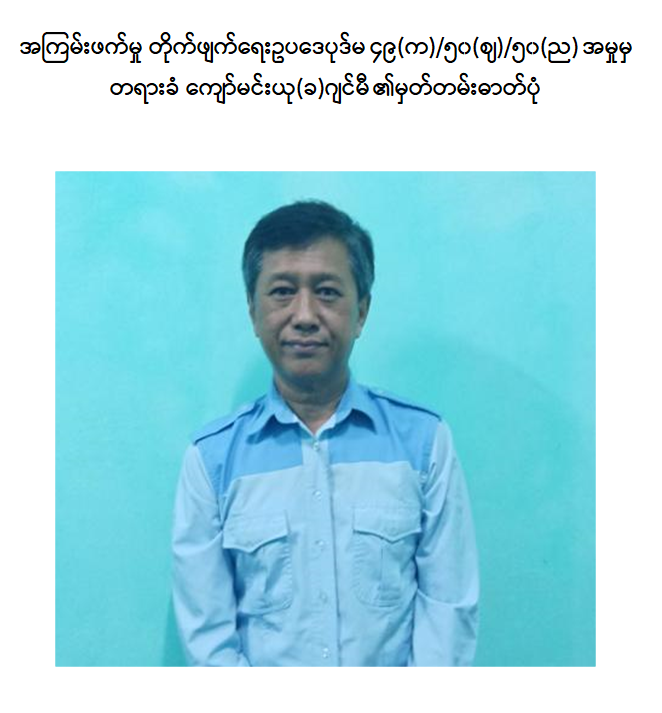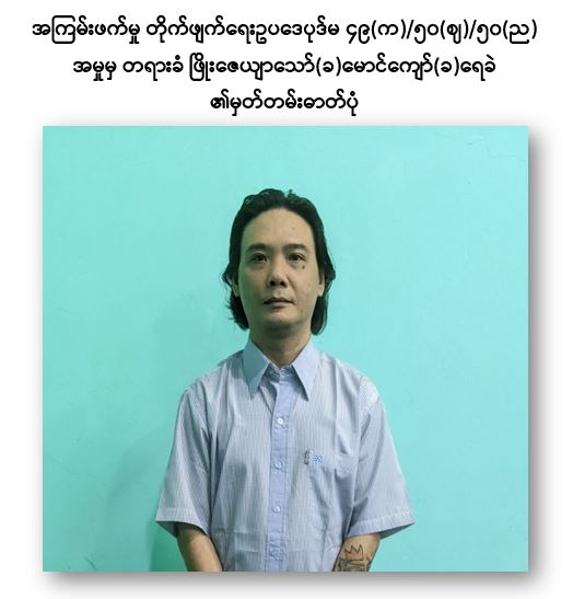 ရန်ကုန်တိုင်းဒေသကြီး၊ အင်းစိန်မြို့နယ်၊ ပိန္နဲကုန်းရပ်ကွက်၊ သရက်ခြံ(၁)လမ်း နေ ကျော်မင်းယု(ခ)ဂျင်မီ (ဘ)ဦးတင်ယု သည် ပြည်ထောင်စုသမ္မတမြန်မာနိုင်ငံ တော်၊ အကြမ်းဖက်မှုတိုက်ဖျက်ရေးဗဟိုအဖွဲ့၊ အမိန့်ကြေညာစာအမှတ်(၂/၂၀၂၁)ဖြင့် အကြမ်းဖက်အုပ်စုအဖြစ် သတ်မှတ်ထားသော CRPH၊ NUG နှင့် PDF အမည်ခံ အကြမ်းဖက်အဖွဲ့များအား မြန်မာနိုင်ငံအတွင်း အကြမ်းဖက်ဖောက်ခွဲဖျက်ဆီးမှု လုပ်ဆောင်ရာတွင် အသုံးပြုမည့် လက်နက်ခဲယမ်းထောက်ပံ့ရန်အတွက် ဒဂုံမြို့သစ် (မြောက်ပိုင်း) မြို့နယ်၊ အမှတ်(၂၇)ရပ်ကွက်၊ ပင်လုံအိမ်ယာ၊ မြနှင်းဆီလမ်းရှိ နေအိမ်၌ AK-47 ၆ လက်၊ M-16 ၈ လက်၊ ၁၂ ဗို့ ၂ လက်၊ တူမီး ၁ လက်၊ ကျည်အိမ်မျိုးစုံ ၁၈ ခုအား သိုဝှက်သိမ်း ဆည်းခြင်းဖြင့် အကြမ်းဖက်မှုကို ဖြစ်စေ၊ အကြမ်းဖက်အုပ်စုတစ်ခုခု၏ အဖွဲ့ဝင်ကို ဖြစ်စေ၊ လက်နက်၊ ခဲယမ်း မီးကျောက်များ ထောက်ပံ့မှု ပြုလုပ်ရန်အတွက် သိုဝှက် သိမ်းဆည်းခြင်း၊ အကြမ်းဖက်အုပ်စုအဖြစ် သတ်မှတ်ကြေညာထားသည့် CRPH၊ NUG ၊ PDF အမည်ခံ အကြမ်းဖက်အဖွဲ့များနှင့် ၎င်းတို့၏ လက်အောက်ခံဖြစ်သည့်  Moon Light  Operation အဖွဲ့များနှင့်  Zoom Meeting ပြုလုပ်၍ ရန်ကုန်မြို့ အတွင်း အကြမ်းဖက်ဖောက်ခွဲဖျက်ဆီးမှု ပြုလုပ်ရန် လှုံ့ဆော်ခြင်း၊ လုံခြုံရေး ဂိတ်များ၊ ရဲစခန်းများ၊ ဌာနဆိုင်ရာရုံးများနှင့် နယ်မြေခံ တပ်များအား တိုက်ခိုက် ဖောက်ခွဲဖျက်ဆီးရန်အတွက် အကြံပေးအဖြစ် ပါဝင် ဆောင်ရွက်ခြင်း၊ အကြမ်းဖက်အုပ်စုအဖြစ် သတ်မှတ်ကြေညာထားသည့် CRPH၊ NUG ၊ PDF အမည်ခံ အကြမ်းဖက်အဖွဲ့များနှင့် ၎င်းတို့၏ လက်အောက်ခံဖြစ်သည့် “နွေဦးကံ့ကော် အဖွဲ့သို့ လက်နက်ခဲယမ်းများ ဝယ်ယူ/ပြုလုပ်ရန်အတွက် ငွေကြေး လွှဲပြောင်းထောက်ပံ့ ပေးခြင်း၊ UMCD အဖွဲ့နှင့်ပူးပေါင်း၍ အမေရိကန်ဒေါ်လာ သိန်း ၁၀၀၀ ခန့်တန်ဖိုးရှိ သေနတ်ထုတ်လုပ်နိုင်သည့် 3D Printer ဝယ်ယူရန် NUG အကြမ်းဖက်အဖွဲ့သို့ ဆက်သွယ်တောင်းခံခဲ့ခြင်း၊ အကြမ်းဖက်အဖွဲ့အစည်း များသို့ ငွေကြေးထောက်ပံ့ရန် အမေရိကန်ဒေါ်လာများအား ဝယ်ယူ၍ မြန်မာငွေဖြင့် လဲလှယ်ပေးမှုများ အကြိမ်ကြိမ် ဆောင်ရွက်ခဲ့ခြင်းဖြင့် အကြမ်းဖက်လုပ်ငန်းများ ဆောင်ရွက်ရာတွင် ငွေကြေး ထောက်ပံ့မှုများ ဆောင်ရွက်ခဲ့ခြင်းတို့ကြောင့်လည်းကောင်း စစ်အုပ်ချုပ်ရေး (Martial Law) စစ်ခုံရုံးဖွဲ့၍ စစ်ဆေးမှုများဆောင်ရွက်ခဲ့ရာ အကြမ်းဖက်မှု တိုက်ဖျက်ရေးဉပဒေပုဒ်မ ၄၉(က)၊ ၅၀(ဈ)နှင့် ၅၀(ည) တို့အရ ဇန်နဝါရီ ၂၁ ရက်တွင် ၎င်းတို့ ၂ ဦးအား “ သေဒဏ် ” အမိန့်ချမှတ်လိုက်ကြောင်း သိရှိရသည်။