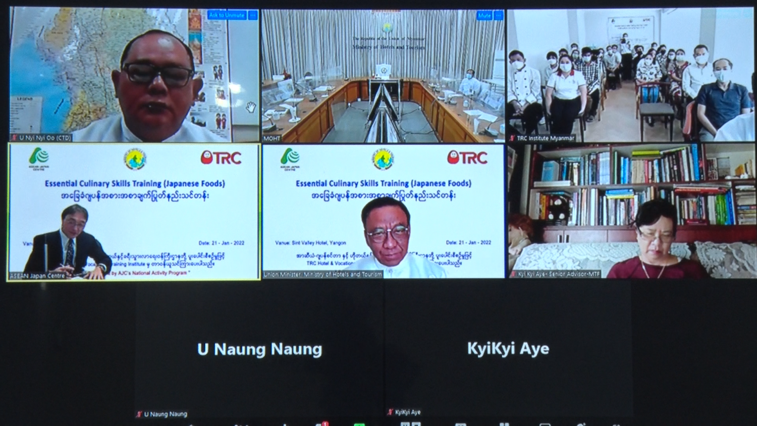 အာဆီယံ-ဂျပန်စင်တာ၏ ထောက်ပံ့မှုဖြင့် ဟိုတယ်နှင့်ခရီးသွားလာရေးဝန်ကြီးဌာနနှင့် TRC Hotel and Vocational Training Institute တို့ ပူးပေါင်းစီစဉ်ဖွင့်လှစ်သော အခြေခံဂျပန်အစား အစာချက်ပြုတ်နည်းသင်တန်းဖွင့်ပွဲကို ယမန်နေ့ မွန်းလွဲပိုင်းတွင် Online စနစ်ဖြင့် ကျင်းပသည်။
