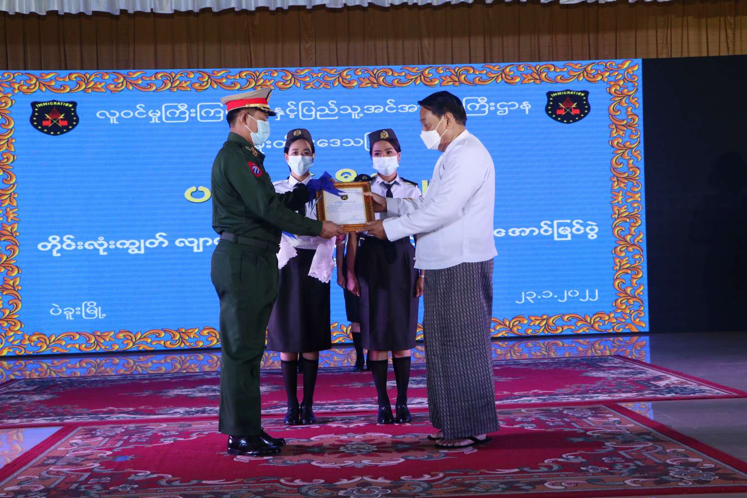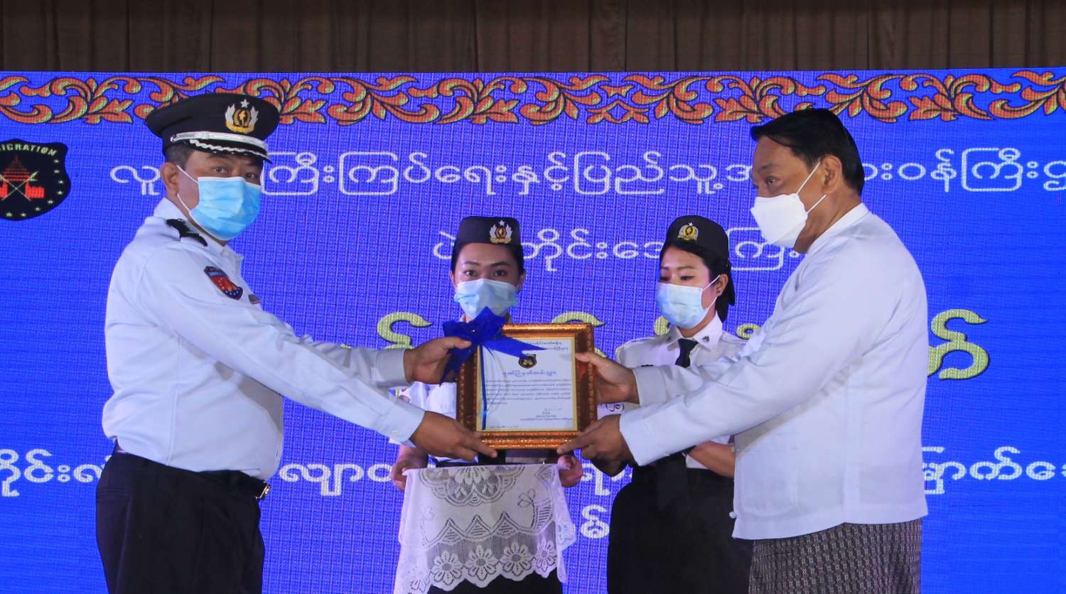 ဆက်လက်၍ တိုင်းဒေသကြီးဝန်ကြီးချုပ်နှင့် အစိုးရအဖွဲ့ အဖွဲ့ဝင်ဝန်ကြီးများက ပန်းခင်းစီမံချက် တိုင်းလုံးကျွတ်လျာထားချက် ရာနှုန်းပြည့်ပြီးမြောက်အောင်မြင်အောင် ကြိုးပမ်းဆောင်ရွက် ပေးကြသည့် ဌာနဆိုင်ရာများမှ တာဝန်ရှိသူများအား ဂုဏ်ပြုမှတ်တမ်းလွှာများနှင့် e-ID လုပ်ငန်း ဆောင်ရွက်ရာတွင် အသုံးပြုရန်အတွက် ကွန်ပျူတာ(၂၈)စုံတို့ကို ပေးအပ်ကြသည်။