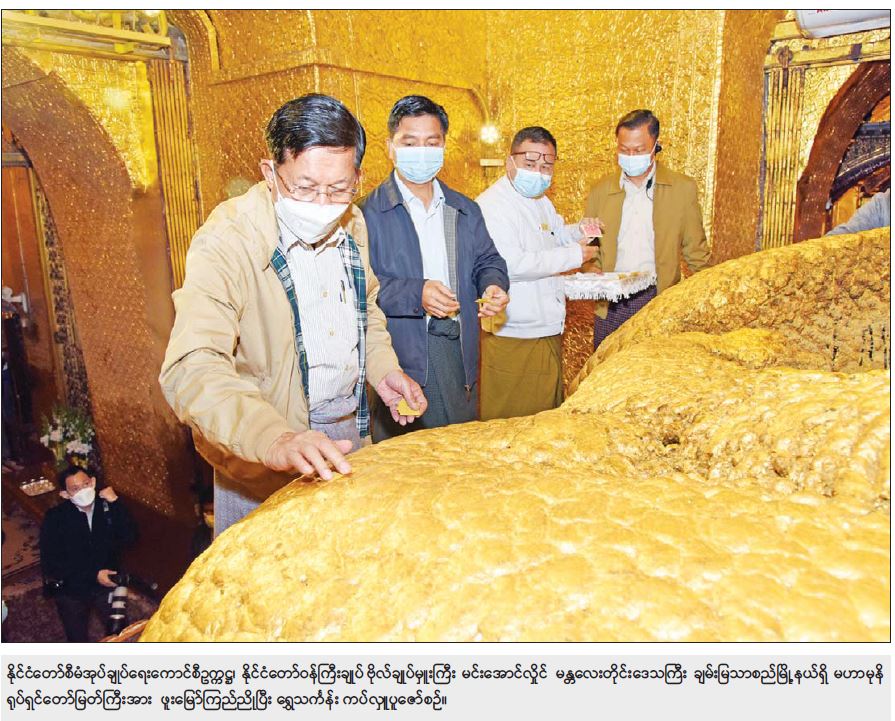 နိုင်ငံတော်စီမံအုပ်ချုပ်ရေးကောင်စီဥက္ကဋ္ဌ၊ နိုင်ငံတော်ဝန်ကြီးချုပ် ဗိုလ်ချုပ်မှူးကြီး မင်းအောင်လှိုင်သည် အဖွဲ့ဝင်များ၊ မန္တလေးတိုင်းဒေသကြီး ဝန်ကြီးချုပ်၊ အလယ်ပိုင်းတိုင်းစစ်ဌာနချုပ်တိုင်းမှူးနှင့် တာဝန်ရှိသူများ လိုက်ပါ၍ ယနေ့နံနက်ပိုင်းတွင် မန္တလေးတိုင်းဒေသကြီး ချမ်းမြသာစည် မြို့နယ်ရှိ မဟာမုနိ ရုပ်ရှင်တော်မြတ်ကြီးအား သွားရောက် ဖူးမြော်ကြည်ညိုသည်။