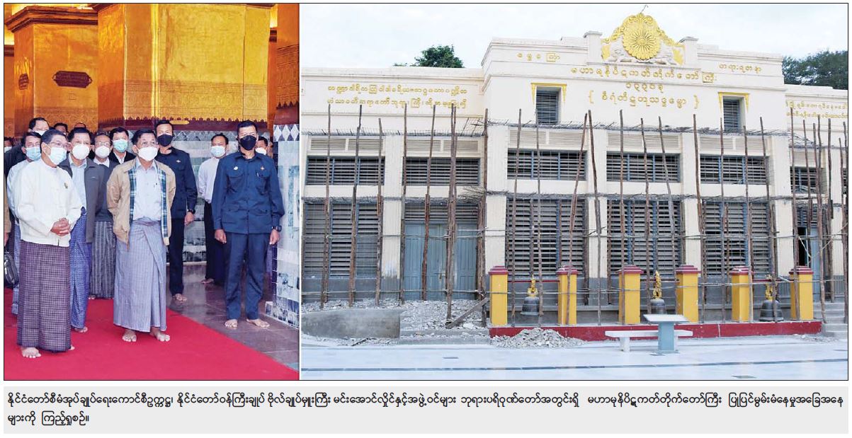 ထို့နောက် နိုင်ငံတော်စီမံအုပ်ချုပ်ရေးကောင်စီဥက္ကဋ္ဌ၊ နိုင်ငံတော်ဝန်ကြီးချုပ်သည် ဘုရားပရိဝုဏ်တော်အတွင်း လက်ယာရစ် လှည့်လည်ပူဇော်၍ ရေရှည်တည်တံ့ခိုင်မြဲရေး ထိန်းသိမ်းဆောင်ရွက် ထားရှိမှုအခြေအနေများနှင့် မဟာမုနိပိဋကတ်တိုက်တော်ကြီး ပြုပြင်မွမ်းမံနေမှု အခြေအနေ များကို ကြည့်ရှုကာ လိုအပ်သည်များ မှာကြားသည်။