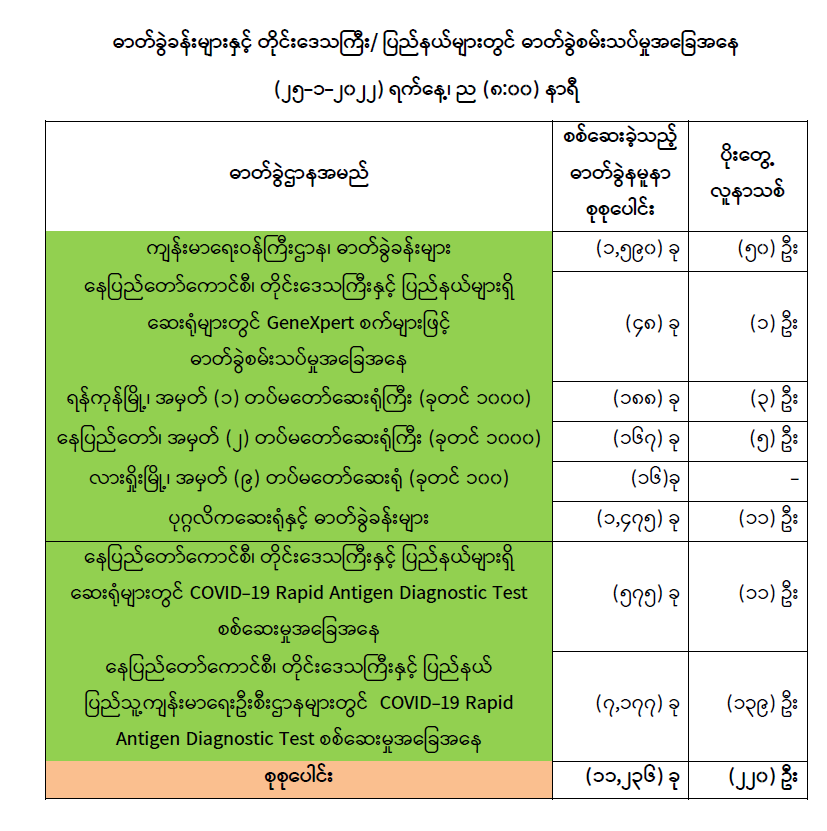 သို့ဖြစ်ပါ၍ ယနေ့အထိ ဓာတ်ခွဲနမူနာစုစုပေါင်း (၆,၂၉၄,၂၉၆) ခုအား စစ်ဆေးခဲ့ပြီး COVID-19 ဓာတ်ခွဲအတည်ပြုလူနာ စုစုပေါင်း (၅၃၄,၃၈၃) ဦး ရှိပြီ ဖြစ်ပါသည်။