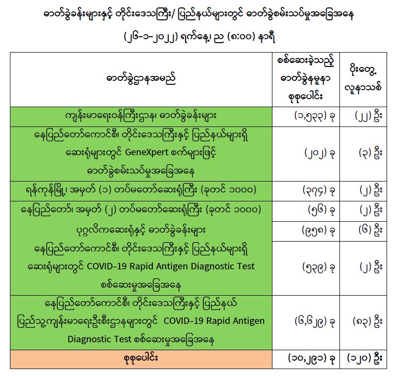 သို့ဖြစ်ပါ၍ ယနေ့အထိ ဓာတ်ခွဲနမူနာစုစုပေါင်း (၆,၃၀၄,၅၈၇) ခုအား စစ်ဆေးခဲ့ပြီး COVID-19 ဓာတ်ခွဲ အတည်ပြုလူနာ စုစုပေါင်း (၅၃၄,၅၀၃) ဦး ရှိပြီ ဖြစ်ပါသည်။