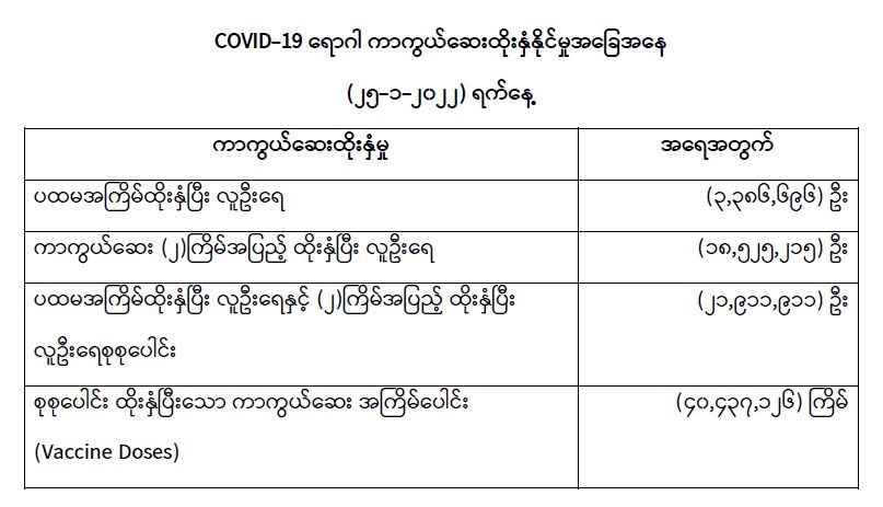 COVID-19 ရောဂါ ကာကွယ်ထိန်းချုပ်ရေးအတွက် တိုင်းဒေသကြီး/ပြည်နယ်များတွင် COVID-19 ရောဂါကာကွယ်ဆေးကို ဦးတည်အုပ်စုများ သတ်မှတ်၍ ထိုးနှံပေးလျက်ရှိရာ (၂၅--၂၀၂၂) ရက်နေ့အထိ လူဦးရေစုစုပေါင်း (၂၁,၉၁၁,၉၁၁) ဦးအား ထိုးနှံပေးပြီးဖြစ်၍ ကာကွယ်ဆေး နှစ်ကြိမ်အပြည့်ထိုးနှံပြီးစီးသူ (၁၈,၅၂၅,၂၁၅) ဦး နှင့် ပထမအကြိမ်ထိုးနှံပြီးစီးသူ (၃,၃၈၆,၆၉၆) ဦး ရှိပြီဖြစ်ပါသည်။ သို့ဖြစ်ပါ၍ (၂၅-၁-၂၀၂၂) ရက်နေ့အထိ မြန်မာနိုင်ငံတွင် COVID-19 ရောဂါကာကွယ်ဆေး အကြိမ်ရေ စုစုပေါင်း (၄၀,၄၃၇,၁၂၆) ကြိမ် ထိုးနှံပြီး ဖြစ်ပါသည်။