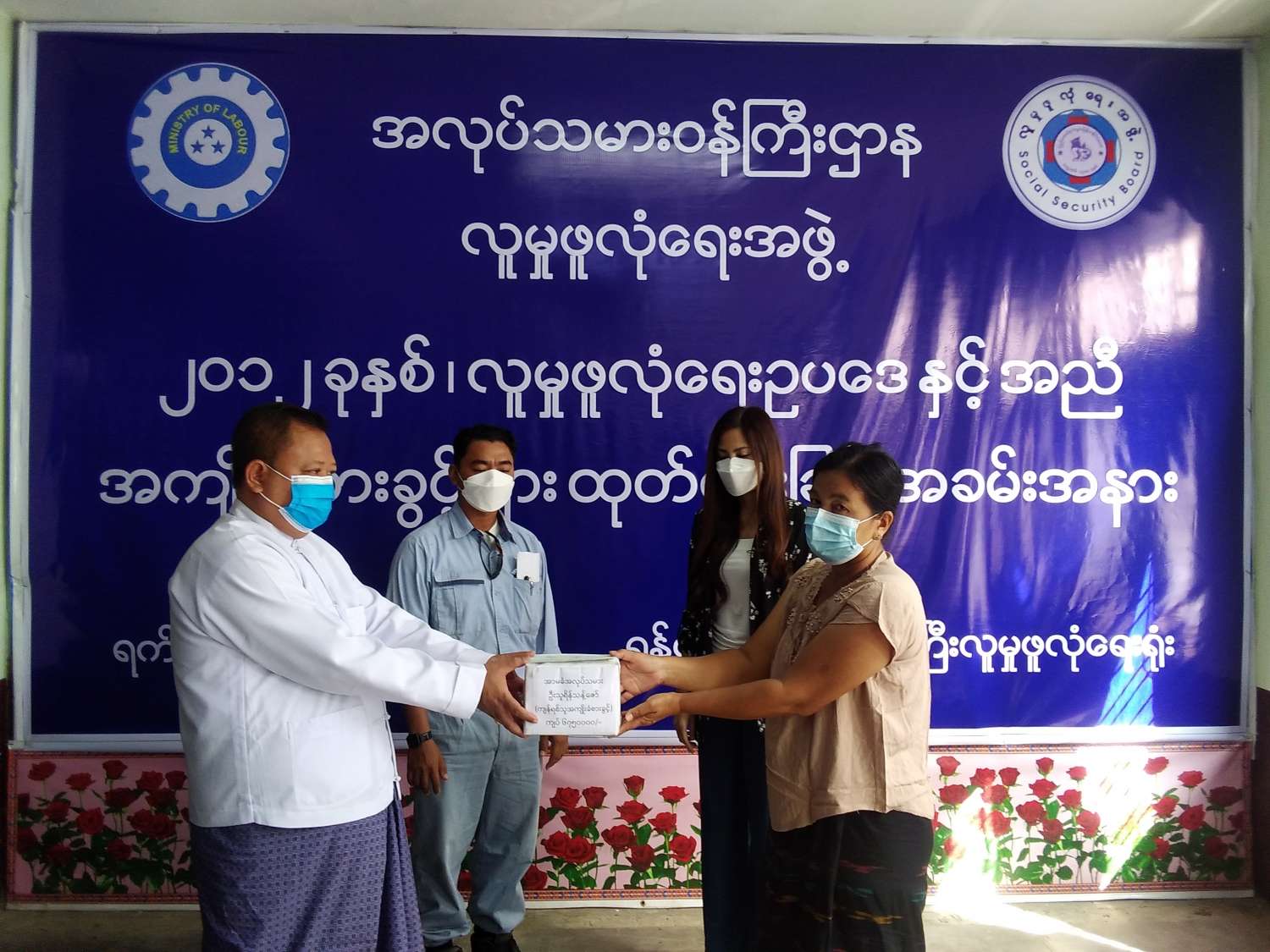 ရန်ကုန်တိုင်းဒေသကြီး တာဝန်ခံအရာရှိ ဦးရဲဇော်ဝင်းက လုပ်ငန်းခွင်အတွင်း မတော်တဆမှုကြောင့် ထိခိုက်သေဆုံးခဲ့သည့် ရန်ကုန်တိုင်း ဒေသကြီး၊ မြို့နယ်လူမှုဖူလုံ ရေးရုံးခွဲ (၇) တွင် အကျုံးဝင်မှတ်ပုံတင်ထားသော J&M Steel Solutions Co.ltd မှ အာမခံအလုပ်သမား ဦးသူရိန်သန့်ဇော်၏ ကျန်ရစ်သူ အကျိုးခံစားခွင့် စုစုပေါင်း ငွေလုံးငွေရင်းကျပ် ၆၇၅၀၀၀၀/- (ကျပ်ခြောက်ဆယ့်ခုနစ်သိန်းငါးသောင်းတိတိ/-) အားကွယ်လွန်သူ၏ မိခင်ဒေါ်သန်းသန်းမြထံသို့ ပေးအပ်ခဲ့သည်။