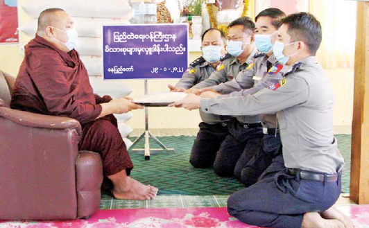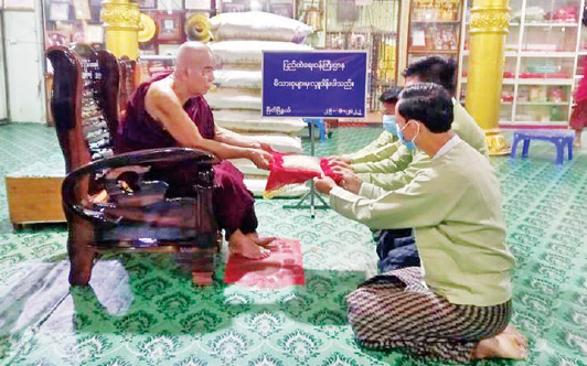 ကိုဗစ်-၁၉ ရောဂါ ကြိုတင်ကာကွယ်ရေးလုပ်ငန်းများ ဆောင်ရွက်နေသည့်ကာလအတွင်း ဆွမ်းကိစ္စရပ်များ အဆင်ပြေစေရန် ရည်ရွယ်၍ ပြည်ထဲရေး ဝန်ကြီးဌာန၊ တပ်ဖွဲ့ဝင်/ဝန်ထမ်း အရာထမ်း၊ အမှုထမ်း မိသားစုများက မြို့နယ်အသီးသီးရှိ ဘုန်းတော်ကြီးကျောင်းများသို့ ဆွမ်းဆန်တော်များ ဆက်ကပ် လှူဒါန်းလျက်ရှိသည်။