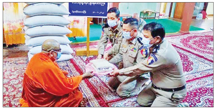 ကိုဗစ်-၁၉ ရောဂါ ကြိုတင်ကာကွယ်ရေးလုပ်ငန်းများ ဆောင်ရွက်နေသည့် ကာလအတွင်း ဆွမ်းကိစ္စရပ်များ အဆင်ပြေစေရန်ရည်ရွယ်၍ ပြည်ထဲရေးဝန်ကြီးဌာန တပ်ဖွဲ့ဝင်ဝန်ထမ်း အရာထမ်း၊ အမှုထမ်းမိသားစုများက မြို့နယ်အသီးသီးရှိ ဘုန်းတော်ကြီးကျောင်းများသို့ ဆွမ်းဆန်တော်များ ဆက်ကပ်လှူဒါန်းခြင်းကို ဆောင်ရွက်လျက်ရှိသည်။
