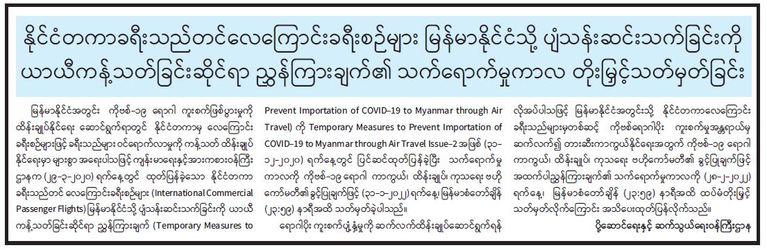 နိုင်ငံတကာခရီးသည်တင်လေကြောင်းခရီးစဉ်များ မြန်မာနိုင်ငံသို့ ပျံသန်းဆင်းသက်ခြင်းကို ယာယီကန့်သတ်ခြင်းဆိုင်ရာ ညွှန်ကြားချက်၏ သက်ရောက်မှုကာလ တိုးမြှင့်သတ်မှတ်ခြင်း
