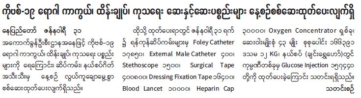 ကိုဗစ် − ၁၉ ရောဂါ ကာကွယ်၊ ထိန်းချုပ်၊ ကုသရေး ဆေးနှင့် ဆေးပစ္စည်းများ နေ့စဉ်စစ်ဆေးထုတ်ပေးလျက်ရှိ 02/01/2022