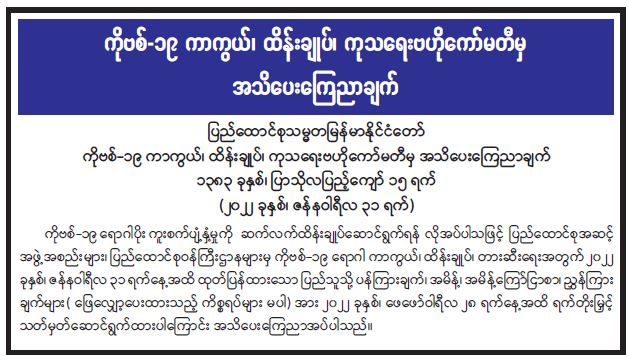 ကိုဗစ် − ၁၉ ကာကွယ်၊ ထိန်းချုပ်၊ ကုသရေးဗဟိုကော်မတီမှ အသိပေးကြေညာချက်
