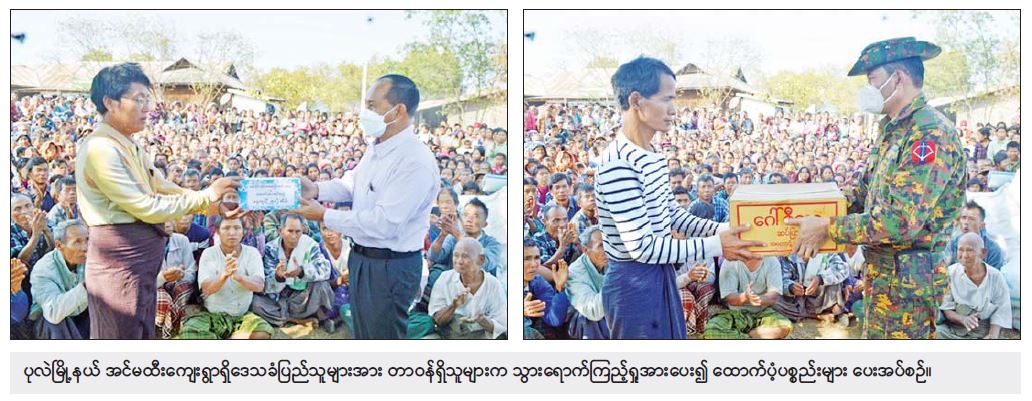 PDF အမည်ခံ အကြမ်းဖက်သမားများ၏ မီးရှို့ဖျက်ဆီးမှုကြောင့် နေအိမ်များ ပျက်စီးဆုံးရှုံး ခဲ့သည့် ပုလဲမြို့နယ် အင်မထီးကျေးရွာမှ ရွာသူ/ရွာသားများအား သွားရောက်တွေ့ဆုံအားပေး၊ လိုအပ်သည်များ ထောက်ပံ့ပေးအပ်