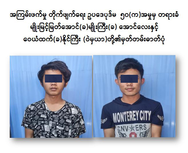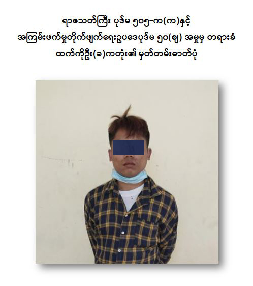 ရန်ကုန်တိုင်းဒေသကြီး၊ ဒဂုံမြို့သစ်(ဆိပ်ကမ်း)မြို့နယ်၊ (၅၈)ရပ်ကွက်၊ ဦးအုန်းလွင်လမ်းနေ ထက်ကိုဦး(ခ)ဂတုံး(ဘ)ဦးဌေးအောင်သည် ၂၀၂၁ ခုနှစ်၊ စက်တင်ဘာလမှစ၍ ဆူပူဆန္ဒပြမှုဖြစ်စဉ် များတွင် တတ်ကြွစွာပါဝင်လှုပ်ရှားခြင်း၊ အကြမ်းဖက်မှု တိုက်ဖျက်ရေးဗဟိုအဖွဲ့၏ အမိန့်ကြော်ငြာစာ အမှတ်(၂/၂၀၂၁)ဖြင့် အကြမ်းဖက် အုပ်စုများအဖြစ်သတ်မှတ်ကြေငြာထားသည့် အဖွဲ့အစည်းများနှင့် ဆက်သွယ် ခြင်း၊ ဒဂုံမြို့သစ်(ဆိပ်ကမ်း)မြို့နဘ်၊ (၈၅)ရပ်ကွက်၊ ဦးအုန်းလွင်လမ်းရှိ အထည်ချုပ်စက်ရုံ အတွင်း၌ FCG-9 သေနတ် ၁ လက်၊ ၉ မမကျည် ၂၃၈ တောင့်၊ ကျည်အိမ် ၃ ခု၊ အပစ်ခလုတ် ၁ ခု၊ သေနတ်ဒင်အစိတ်အပိုင်း ၁ ခု၊ ကိုယ်ထည် အစိတ်အပိုင်း ၁ ခု၊ သေနတ်ပြောင်း ၆ ခု၊ မောင်းပြန်စပရိန် ၁ ချောင်း၊ လက်လုပ်မိုင်း ၄ လုံး၊ TNT မိုင်း ၄ လုံး၊ ယမ်းကြိုး ၁ ထုတ်၊ PVC ပိုက်ဖြင့် ပြုလုပ်ထားသော လက်လုပ်မိုင်း ၁ လုံးတို့အား သိမ်းဆည်းထားခဲ့ခြင်းဖြင့် အကြမ်းဖက်ဗုံးခွဲ တိုက်ခိုက် မှုဆိုင်ရာပြစ်မှုကို ကျူးလွန်ခဲ့ခြင်းအတွက်ကြောင့် လည်းကောင်း၊ ရန်ကုန်တိုင်းဒေသ ကြီး၊ သင်္ဃန်းကျွန်းမြို့နယ်၊ စံပြရပ်ကွက်၊ စံပြ(၁)လမ်း၊အမှတ်(၃၇၁)နေ ဝေယံထက် (ခ)နိုင်ကြီး(ဘ)ဦးဇော်မင်းလှိုင်၊ ဒဂုံမြို့သစ် (မြောက်ပိုင်း) မြို့နယ်၊ (၄၅)ရပ်ကွက်၊ ကြေးတိုင်လမ်း၊ အမှတ်(၂၈)နေ မျိုးမြင့်မြတ်အောင်(ခ) မျိုးကြီး(ခ)အောင်လေး (ဘ) ဦးကျော်ဇေယျအောင်နှင့် (၄၀)ရပ်ကွက်၊ ဗိုလ်တေဇလမ်း၊ အမှတ်(၉၉)နေ ဝင်းဇော်မိုး(ခ) မိုးဟိန်း(ခ) Brain Wave (ဘ)ဦးကျော်မင်းမင်းကို တို့သည် တောင်ဥက္ကလာပမြို့မ ရဲစခန်းအား ၄၀ မမလောင်ချာ ၁ လက်ဖြင့် ပစ်ခတ်ခဲ့ခြင်းဖြင့် အများပြည်သူ၏ လုံခြုံရေးကိုဖြစ်စေ၊ အသက်အိုးအိမ်စည်းစိမ်ကိုဖြစ်စေ၊ အများ ပြည်သူ(သို့မဟုတ်)တစ်ဦးတစ်ယောက်အတွက် အရေးကြီးသော အခြေခံအဆောက် အဦများကိုဖြစ်စေ၊ နိုင်ငံပိုင်အဆောက်အဦကိုဖြစ်စေ ပြင်းထန်စွာ ထိခိုက်ဆုံးရှုံးစေ ရန်ပြလုပ်ခဲ့ခြင်းကြောင့် လည်းကောင်း စစ်အုပ်ချုပ်ရေး(Martial Law)စစ်ခုံရုံးဖွဲ့၍ စစ်ဆေးမှုများ ဆောင်ရွက်ခဲ့ရာ အကြမ်းဖက်မှုတိုက်ဖျက်ရေး ဥပဒေပုဒ်မ ၅၀(ဈ)၊ ရာဇသတ်ကြီး ပုဒ်မ-၅၀၅(က)(က)နှင့် ၅၀(က) တို့အရ ၂၀၂၁ ခုနှစ်၊ ဖေဖော်ဝါရီ ၂ ရက်တွင် ၎င်းတို့အား “ထောင်ဒဏ် တစ်သက် ” ပြစ်ဒဏ်ကို အမိန့်ချ မှတ်လိုက် ကြောင်း သိရှိရသည်။