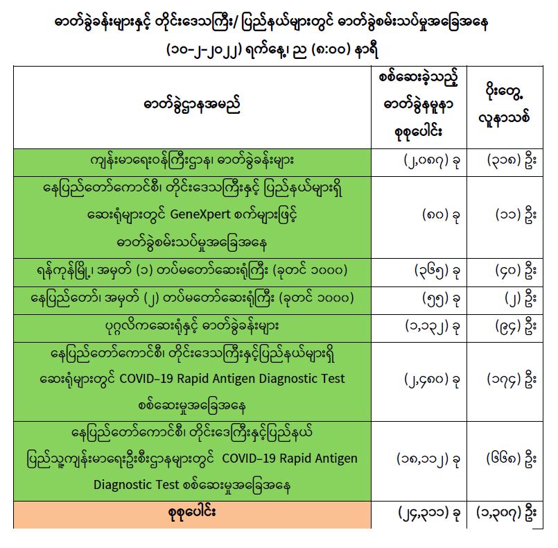 သို့ဖြစ်ပါ၍ ယနေ့အထိ ဓာတ်ခွဲနမူနာစုစုပေါင်း (၆,၆၁၉,၅၄၂) ခုအား စစ်ဆေးခဲ့ပြီး COVID-19 ဓာတ်ခွဲအတည်ပြုလူနာ စုစုပေါင်း (၅၄၁,၉၀၄) ဦး ရှိပြီ ဖြစ်ပါသည်။