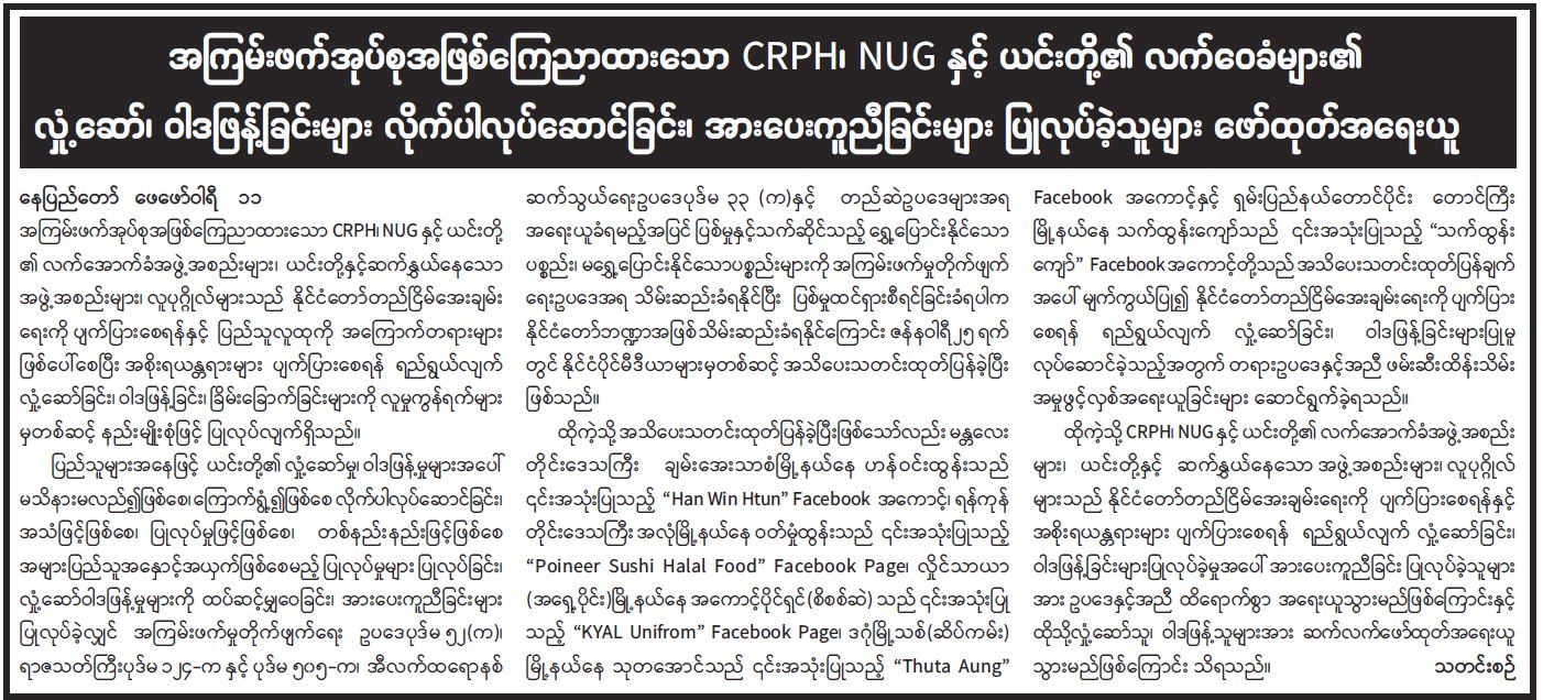 အကြမ်းဖက်အုပ်စုအဖြစ်ကြေငြာထားသော CRPH၊ NUG နှင့် ယင်းတို့၏ လက်ဝေခံများ၏ လှုံ့ဆော်၊ ဝါဒဖြန့်ခြင်းများအား လိုက်ပါလုပ်ဆောင်ခြင်း၊ အားပေးကူညီခြင်းများ ပြုလုပ်ခဲ့သူများ ဖော်ထုတ်အရေးယူ 02/12/2022