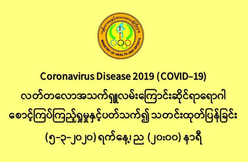 ၁။ ကျန်းမာရေးနှင့်အားကစားဝန်ကြီးဌာနသည် တရုတ်ပြည်သူ့သမ္မတနိုင်ငံအပါအဝင် ကမ္ဘာ့နိုင်ငံ (၇၇) နိုင်ငံတွင် ကူးစက်ပျံ့နှံ့လျက်ရှိသည့် COVID-19 လတ်တလောအသက်ရှူလမ်းကြောင်းဆိုင်ရာ ရောဂါဖြစ်ပွားမှုဖြစ်စဉ်နှင့်ပတ်သက်၍ ရောဂါစောင့်ကြပ်ကြည့်ရှုခြင်း လုပ်ငန်းများအား အပြည်ပြည် ဆိုင်ရာ ဝင်ပေါက်၊ ထွက်ပေါက်ဂိတ်များတွင်လည်းကောင်း၊ ဆေးရုံအခြေပြုအဖြစ်လည်းကောင်း၊ ပြည်သူ လူထုအခြေပြု စောင့်ကြပ်ကြည့်ရှုခြင်းလုပ်ငန်းများဖြင့်လည်းကောင်း၊ ပုဂ္ဂလိကဆေးရုံများ နှင့် ပူးပေါင်း၍လည်းကောင်း ဆောင်ရွက်လျက်ရှိပါသည်။