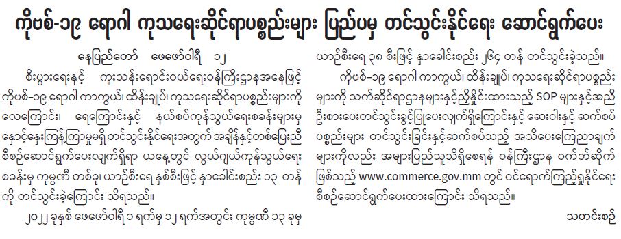ကိုဗစ်- ၁၉ ရောဂါ ကုသရေးဆိုင်ရာပစ္စည်းများ ပြည်ပမှ တင်သွင်းနိုင်ရေး ဆောင်ရွက်ပေး