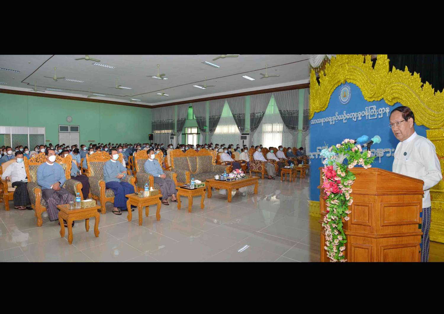 ရှေးဦးစွာ ပြည်ထောင်စုဝန်ကြီး ဦးကိုကိုက (၇၅)နှစ်မြောက် စိန်ရတုပြည်ထောင်စုနေ့ ဂုဏ်ပြုအခမ်းအနားတွင် ပါဝင်ဆောင်ရွက်ခဲ့ကြသည့် ဝန်ထမ်းများ၊ ကူညီပံ့ပိုးပေးခဲ့သည့် ပုဂ္ဂိုလ်များကို ဂုဏ်ယူအသိအမှတ်ပြုပါကြောင်း၊ သာသနာရေးနှင့် ယဉ်ကျေးမှုဝန်ကြီးဌာနမှ ဝန်ထမ်းများသည် ဝန်ကြီးဌာန စိတ်ဓာတ်၊ အနုပညာသမားပီသသော အနုပညာသည် စိတ်ဓာတ်၊ နိုင်ငံ့ဝန်ထမ်းကောင်းပီသသော နိုင်ငံ့ဝန်ထမ်းစိတ်ဓာတ်အပြည့်အဝဖြင့် မိမိဝန်ကြီးဌာန က ဆောင်ရွက်ရသောလုပ်ငန်း တာဝန်များကို အပြည့်အဝ ထမ်းဆောင်ခဲ့ကြသည်ကို မြင်တွေ့ရပါကြောင်းနှင့် ဂုဏ်ပြုချီးမွမ်းထိုက်သူများ ဖြစ်ကြပါ ကြောင်း ပြောကြားသည်။