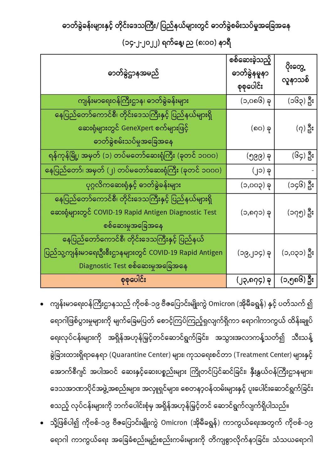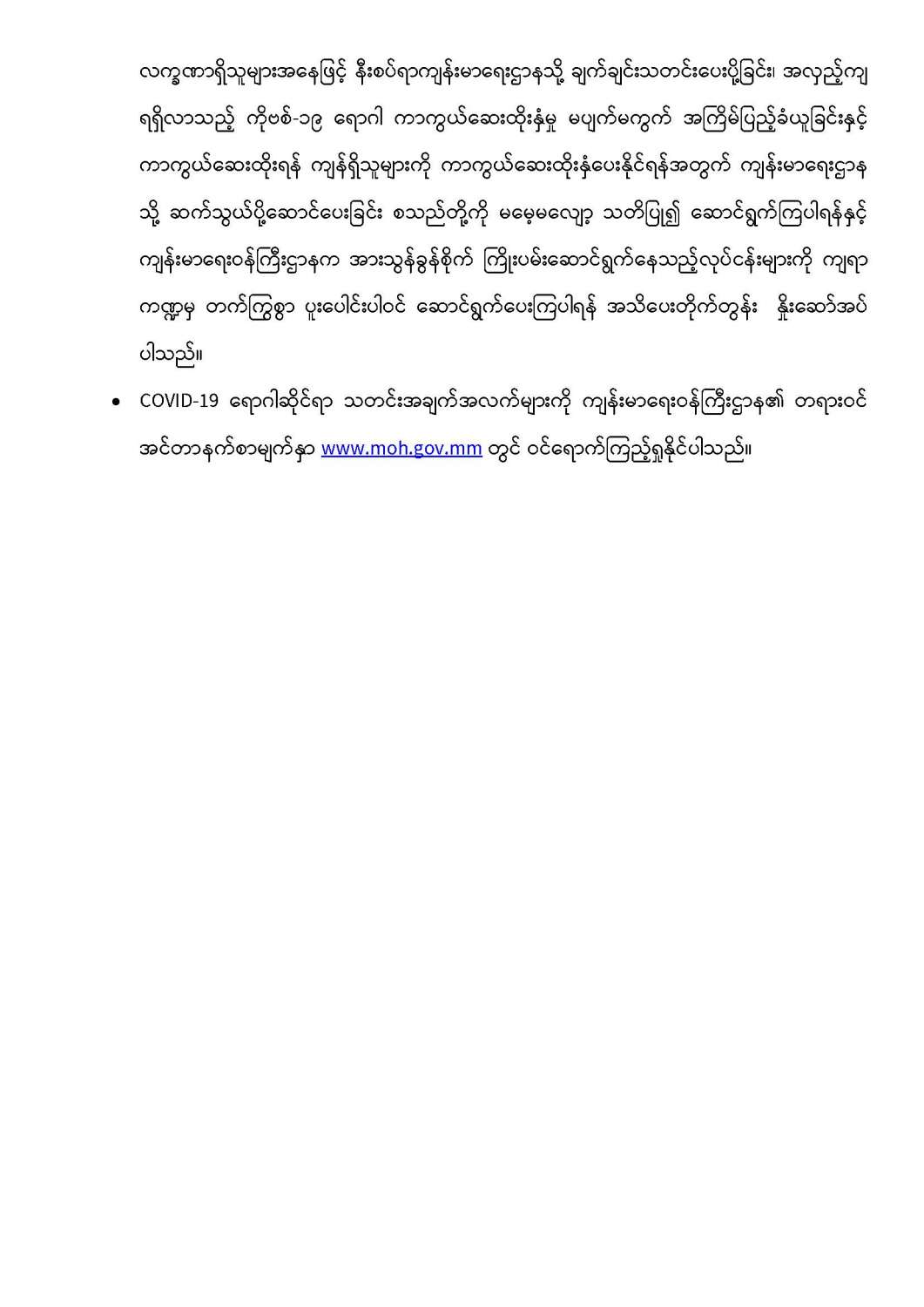 ကျန်းမာရေးဝန်ကြီးဌာနအနေဖြင့် နိုင်ငံအတွင်း ကူးစက်ဖြစ်ပွားနေသော COVID-19 ရောဂါ ကာကွယ်၊ ကုသ၊ ထိန်းချုပ်ရေးလုပ်ငန်းများကို အရှိန်အဟုန်မြှင့် ဆောင်ရွက်လျက်ရှိပါသည်။
