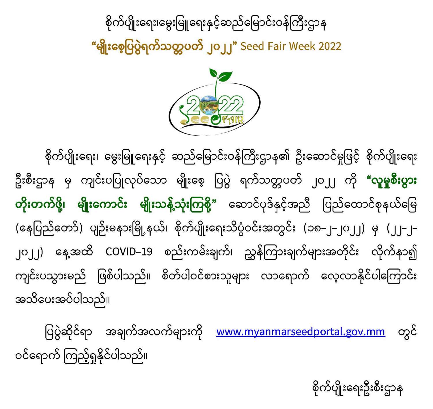 “မျိုးစေ့ပြပွဲရက်သတ္တပတ် ၂၀၂၂” Seed Fair Week 2022