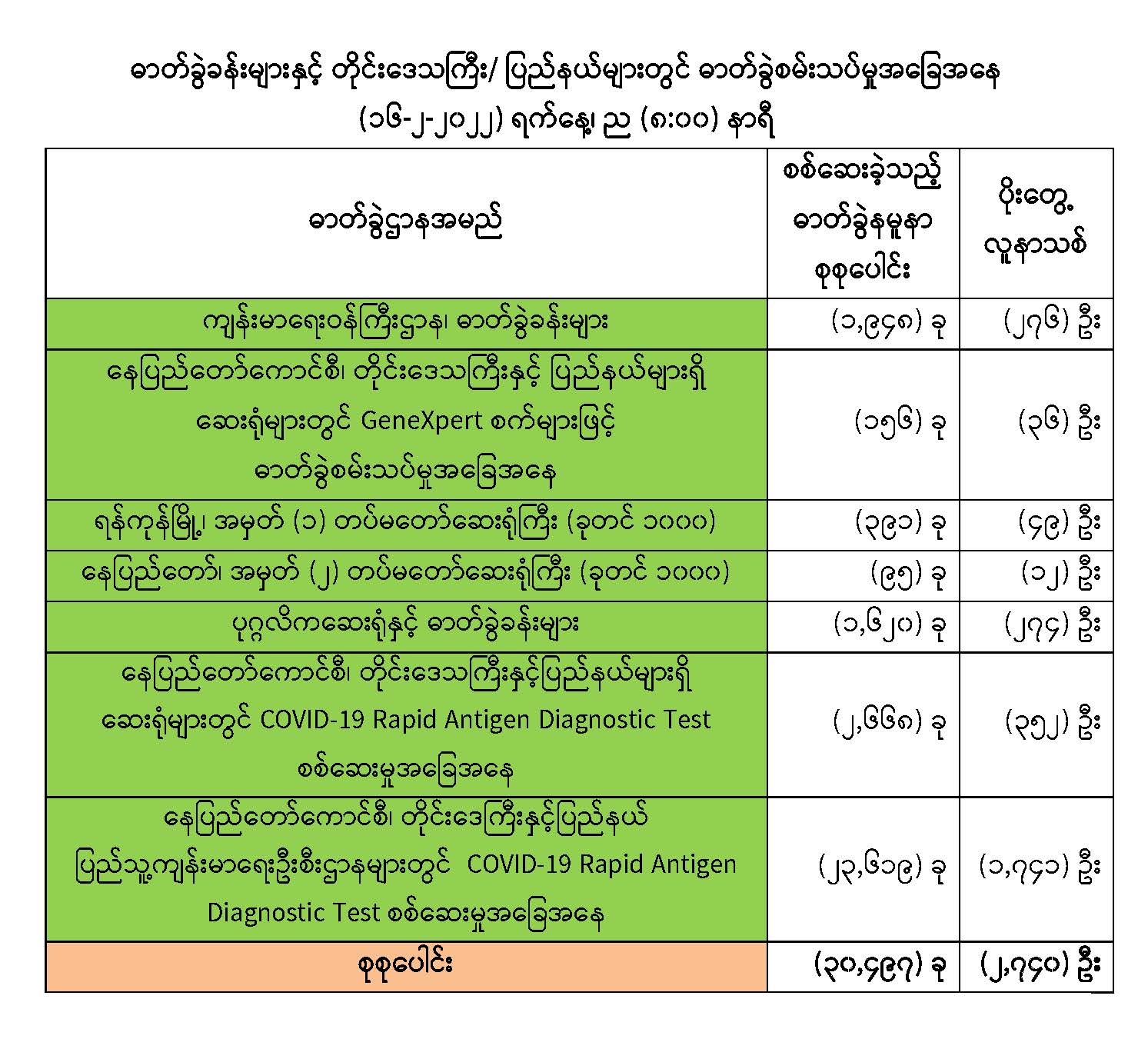 COVID-19 သံသယလူနာများ၊ ဓာတ်ခွဲအတည်ပြုလူနာနှင့် အနီးကပ်ထိတွေ့ခဲ့သူများနှင့် အသွားအလာ ကန့်သတ်ထားရှိသူများအား COVID-19 ရောဂါ ရှိ၊ မရှိ ဓာတ်ခွဲစမ်းသပ်စစ်ဆေးခြင်းအား ပုံမှန်ဆောင်ရွက်လျက်ရှိပြီး (၁၅-၂-၂၀၂၂) ရက်နေ့၊ ည (၈:၀၀) နာရီမှ (၁၆-၂-၂၀၂၂) ရက်နေ့၊ ည (၈:၀၀) နာရီအတွင်း ဓာတ်ခွဲနမူနာစုစုပေါင်း (၃၀,၄၉၇) ခုအား စစ်ဆေးပြီးစီးခဲ့ရာ COVID-19 ရောဂါ ဓာတ်ခွဲအတည်ပြုလူနာသစ် (၂,၇၄၀) ဦး တွေ့ရှိရပါသည်။ ထို့ကြောင့် ယနေ့အတွက် ရောဂါ ပိုးတွေ့ရှိမှု ရာခိုင်နှုန်းမှာ (၈.၉၈) ရာခိုင်နှုန်း ရှိပါသည်။
