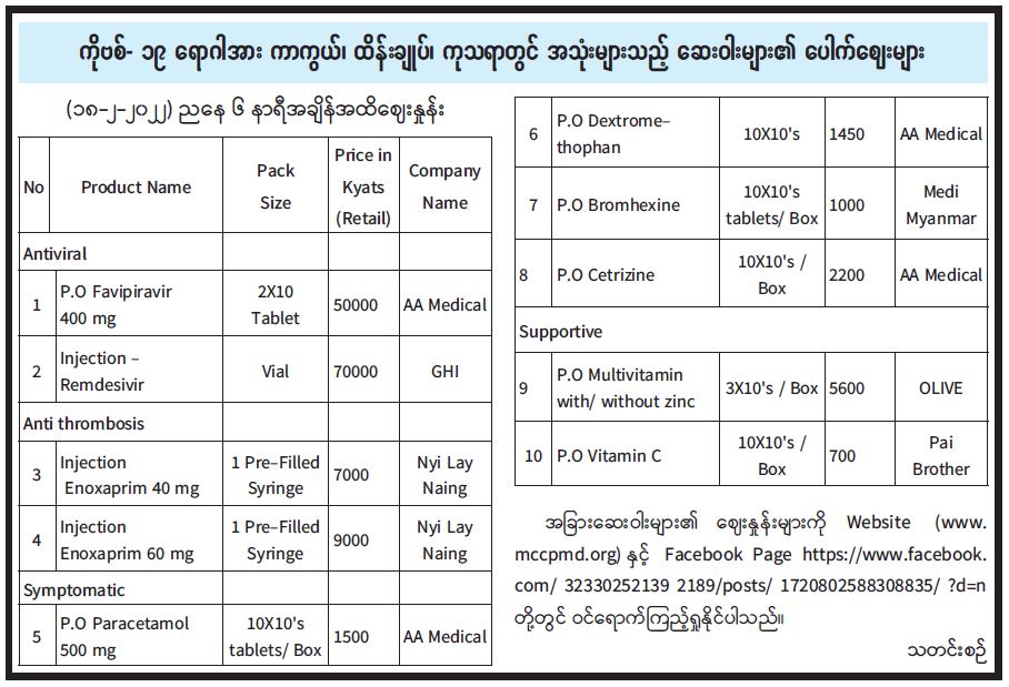 ကိုဗစ်- ၁၉ ရောဂါအား ကာကွယ်၊ ထိန်းချုပ်၊ ကုသရာတွင် အသုံးများသည့် ဆေးဝါးများ၏ ပေါက်ဈေးများ (၁၈-၂-၂၀၂၂) ညနေ ၆ နာရီအချိန်ထိဈေးနှုန်း