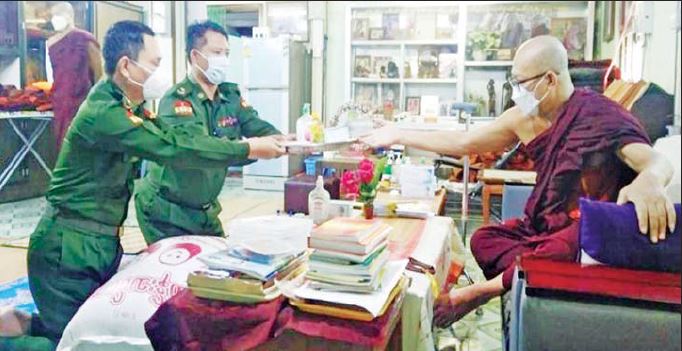 ထိုသို့ဆောင်ရွက်လျက်ရှိရာ ယနေ့တွင်ရန်ကုန်တိုင်းဒေသကြီး၊ မင်္ဂလာဒုံမြို့နယ် အမှတ်(၃/ခ) ရပ်ကွက်ရှိ မာလာရုံကျောင်းတိုက်၊ ဒလမြို့နယ် ဗညားဒလရပ်ကွက်ရှိ အေးစေတီဓမ္မရိပ်သာ ကျောင်းတိုက်၊ ဧရာဝတီတိုင်းဒေသကြီး ပုသိမ်မြို့ရှိ မနောသုခကျောင်းတိုက်၊ စစ်ကိုင်းတိုင်းဒေသကြီး ခန္တီးမြို့ ပေါမိုင်းရပ်ကွက်ရှိ ထေရဝါဒဗုဒ္ဓသာသနာပြု (ဗဟို)ကျောင်း  တိုက်နှင့် မန္တလေးတိုင်းဒေသကြီး ပုသိမ်ကြီးမြို့နယ်ရှိ သရက်တောကျောင်းတိုက်တို့ရှိ ဆရာတော်၊  သံဃာတော်များ၊ သာသနာ့နွယ်ဝင် သီလရှင်များအား ဆွမ်းဆန်တော်၊ ဆီ၊ ဆား၊ ပဲအမယ်လေးမျိုး၊ နဝကမ္မအလှူငွေများ၊ ကိုဗစ်-၁၉ ရောဂါ ကာကွယ်ရေး အထောက်အကူပြုပစ္စည်းများ၊ နေ့ဆွမ်းများနှင့် လှူဖွယ်ပစ္စည်းများကို သက်ဆိုင်ရာ တိုင်းစစ်ဌာနချုပ်  အသီးသီးမှ တာဝန်ရှိသူများက သွားရောက်ဆက်ကပ်လှူဒါန်းကြပြီး လိုအပ်သည့် ကျန်းမာရေး စစ်ဆေးပေးခြင်းများ ဆောင်ရွက်ပေးခဲ့ကြောင်း သတင်းရရှိသည်။