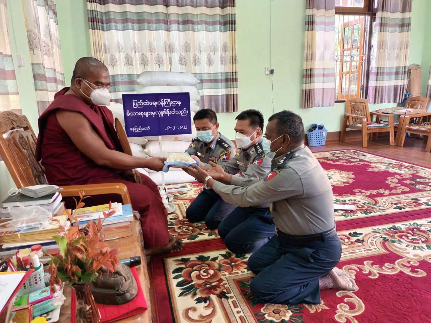 ပြည်ထဲရေးဝန်ကြီးဌာန၊ တပ်ဖွဲ့ဝင်/ဝန်ထမ်း အရာထမ်း၊ အမှုထမ်းမိသားစုများသည် မြို့နယ်အသီးသီးရှိ ဘုန်းတော်ကြီးကျောင်းများသို့ ဆွမ်းဆန် တော်များ ဆက်ကပ်လှူဒါန်းလျက်ရှိသည်။