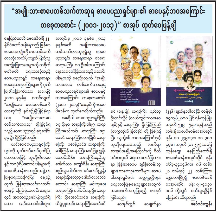 “အမျိုးသားစာပေတစ်သက်တာဆုရ စာပေပညာရှင်များ၏ စာပေနှင့်ဘဝအကြောင်း တစေ့တစောင်း (၂၀၀၁-၂၀၁၃)” စာအုပ် ထုတ်ဝေဖြန့်ချိ 02/23/2022