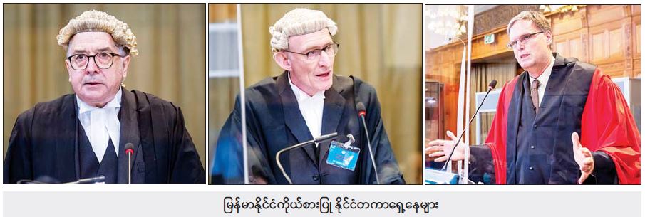 ထို့နောက် မြန်မာနိုင်ငံကိုယ်စားပြု နိုင်ငံတကာရှေ့နေများဖြစ်ကြသော Dr. Christopher Staker က ဂမ်ဘီယာနိုင်ငံသည် အိုအိုင်စီ၏ တာဝန်ပေးချက်အရ အိုအိုင်စီကိုယ်စား တရားစွဲပေးခြင်းဖြစ်၍ ယခုအမှုကို တရားရုံးက လက်မခံသင့်ကြောင်း၊ အိုအိုင်စီသည် နိုင်ငံတကာ အဖွဲ့အစည်းတစ်ခုဖြစ်၍ အပြည်ပြည်ဆိုင်ရာတရားရုံး၏ ဥပဒေအရ အငြင်းပွားမှု တင်သွင်းခွင့်မရှိသဖြင့် ကန့်ကွက်ကြောင်း လျှောက်လဲချက်ကို လည်းကောင်း၊ Professor Stefan Talmon က ဂမ်ဘီယာနိုင်ငံသည် နစ်နာသူနိုင်ငံမဟုတ်၍ တရားစွဲခွင့်မရှိကြောင်း၊ ၁၉၄၈ ခုနှစ် လူမျိုးသုဉ်းစေမှုကို တားဆီးရန်နှင့် ပြစ်ဒဏ်ပေးရန် နိုင်ငံတကာ သဘောတူစာချုပ်က အဖွဲ့ဝင်နိုင်ငံများအနေဖြင့် ၎င်းတို့အပေါ် ထိခိုက်မှုမရှိပါက တရားစွဲခွင့် ပေးမထားကြောင်း လျှောက်လဲချက်ကို လည်းကောင်း၊ Professor Robert Kolb က မြန်မာနိုင်ငံသည် ၁၉၄၈ ခုနှစ် လူမျိုးသုဉ်းစေမှုကို တားဆီးရန်နှင့် ပြစ်ဒဏ်ပေးရန် နိုင်ငံတကာသဘောတူစာချုပ်၏ အာတီကယ် (၈)ကို ခြွင်းချက်ပြုလုပ်ထား၍ မည်သည့်စာချုပ်ဝင် နိုင်ငံကမဆို ကုလသမဂ္ဂ၏ အဖွဲ့အစည်းများ (အပြည်ပြည်ဆိုင်ရာတရားရုံး အပါအဝင်) သို့ စာချုပ်ဝင် နိုင်ငံတစ်နိုင်ငံအား အရေးယူဆောင်ရွက်ရန် တောင်းဆိုမှုကို လိုက်နာရန်မလိုကြောင်း လျှောက်လဲချက်ကို လည်းကောင်း၊ Dr. Christopher Staker က ၁၉၄၈ ခုနှစ် လူမျိုးသုဉ်းစေမှုကို တားဆီးရန်နှင့် ပြစ်ဒဏ်ပေးရန် နိုင်ငံတကာ သဘောတူစာချုပ်၏ အာတီကယ် (၉)အရ တရားရုံးသို့ အမှုတင်သွင်းရန် အဖွဲ့ဝင်နှစ်နိုင်ငံအကြား ဥပဒေကြောင်းအရ အငြင်းပွားမှုရှိရန် လိုအပ်ကြောင်း၊ ဂမ်ဘီယာနိုင်ငံနှင့် မြန်မာနိုင်ငံအကြား ဥပဒေကြောင်းအရ အငြင်းပွားမှု လုံးဝမရှိကြောင်း လျှောက်လဲချက်ကို လည်းကောင်း တရားရုံးသို့ တင်သွင်းခဲ့ကြပါသည်။