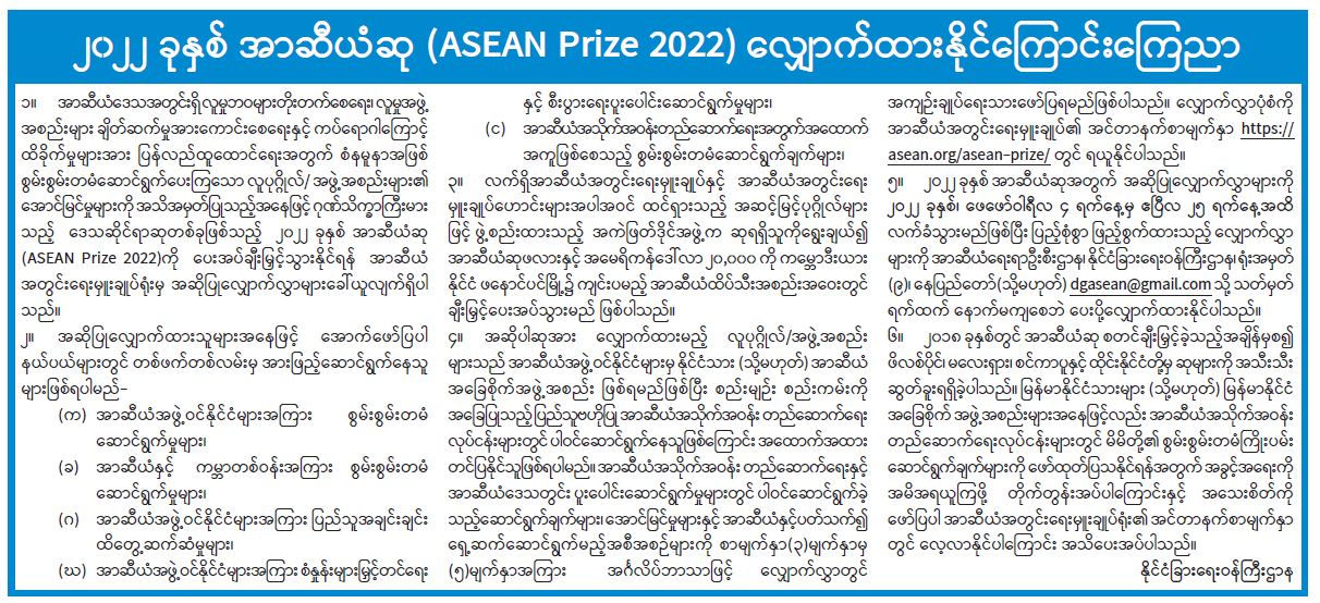 ၂၀၂၂ ခုနှစ် အာဆီယံဆု (ASEAN Prize 2022) လျှောက်ထားနိုင်ကြောင်းကြေညာ