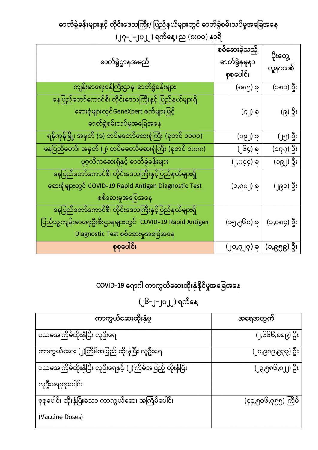 COVID-19 ရောဂါ ကာကွယ်ထိန်းချုပ်ရေးအတွက် တိုင်းဒေသကြီး/ပြည်နယ်များတွင် COVID-19 ရောဂါကာကွယ်ဆေးကို ဦးတည်အုပ်စုများသတ်မှတ်၍ ထိုးနှံပေးလျက်ရှိရာ (၂၆-၂-၂၀၂၂) ရက်နေ့ အထိ လူဦးရေ စုစုပေါင်း (၂၃,၅၈၆,၈၂၂) ဦးအား ထိုးနှံပေးပြီးဖြစ်၍ ကာကွယ်ဆေးနှစ်ကြိမ် အပြည့် ထိုးနှံပြီးစီးသူ (၂၀,၉၁၉,၉၃၃) ဦးနှင့် ပထမအကြိမ်ထိုးနှံပြီးစီးသူ (၂,၆၆၆,၈၈၉) ဦး ရှိပြီဖြစ်ပါသည်။ သို့ဖြစ်ပါ၍ (၂၆-၂-၂၀၂၂) ရက်နေ့အထိ မြန်မာနိုင်ငံတွင် COVID-19 ရောဂါကာကွယ်ဆေး အကြိမ်ရေ စုစုပေါင်း (၄၄,၅၀၆,၇၅၅) ကြိမ် ထိုးနှံပြီးဖြစ်ပါသည်။