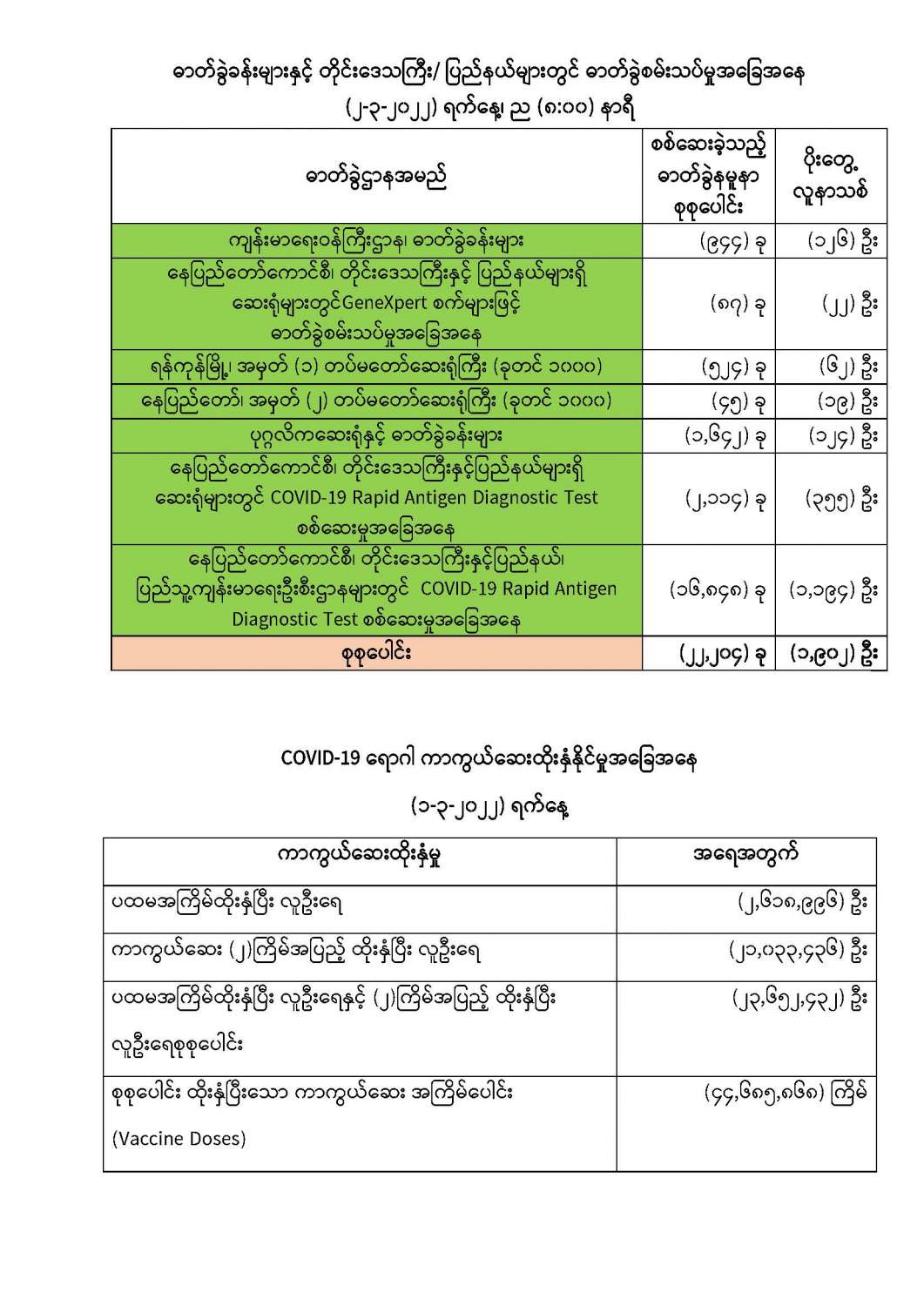 COVID-19 ရောဂါ ကာကွယ်ထိန်းချုပ်ရေးအတွက် တိုင်းဒေသကြီး/ ပြည်နယ်များတွင် COVID-19 ရောဂါကာကွယ်ဆေးကို ဦးတည်အုပ်စုများသတ်မှတ်၍ ထိုးနှံပေးလျက်ရှိရာ (၁-၃-၂၀၂၂) ရက်နေ့အထိ လူဦးရေစုစုပေါင်း (၂၃,၆၅၂,၄၃၂) ဦးအား ထိုးနှံပေးပြီးဖြစ်၍ ကာကွယ်ဆေးနှစ်ကြိမ်အပြည့် ထိုးနှံပြီးစီးသူ (၂၁,၀၃၃,၄၃၆) ဦး နှင့် ပထမအကြိမ် ထိုးနှံပြီးစီးသူ (၂,၆၁၈,၉၉၆) ဦး ရှိပြီဖြစ်ပါသည်။ သို့ဖြစ်ပါ၍ (၁-၃-၂၀၂၂) ရက်နေ့အထိ မြန်မာနိုင်ငံတွင် COVID-19 ရောဂါကာကွယ်ဆေး အကြိမ်ရေ စုစုပေါင်း (၄၄,၆၈၅,၈၆၈) ကြိမ် ထိုးနှံပြီး ဖြစ်ပါသည်။