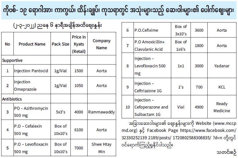 ကိုဗစ်-၁၉ ရောဂါအား ကာကွယ်၊ ထိန်းချုပ်၊ ကုသရာတွင် အသုံးများသည့် ဆေးဝါးများ၏ ပေါက်ဈေးများ
